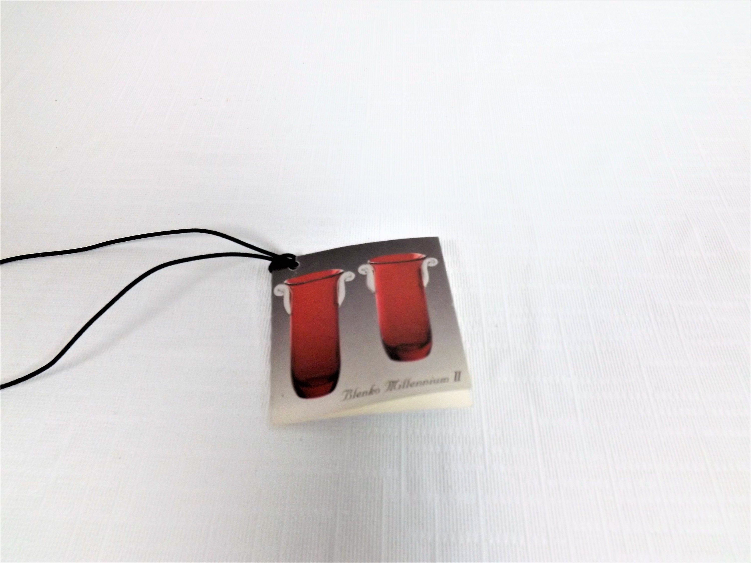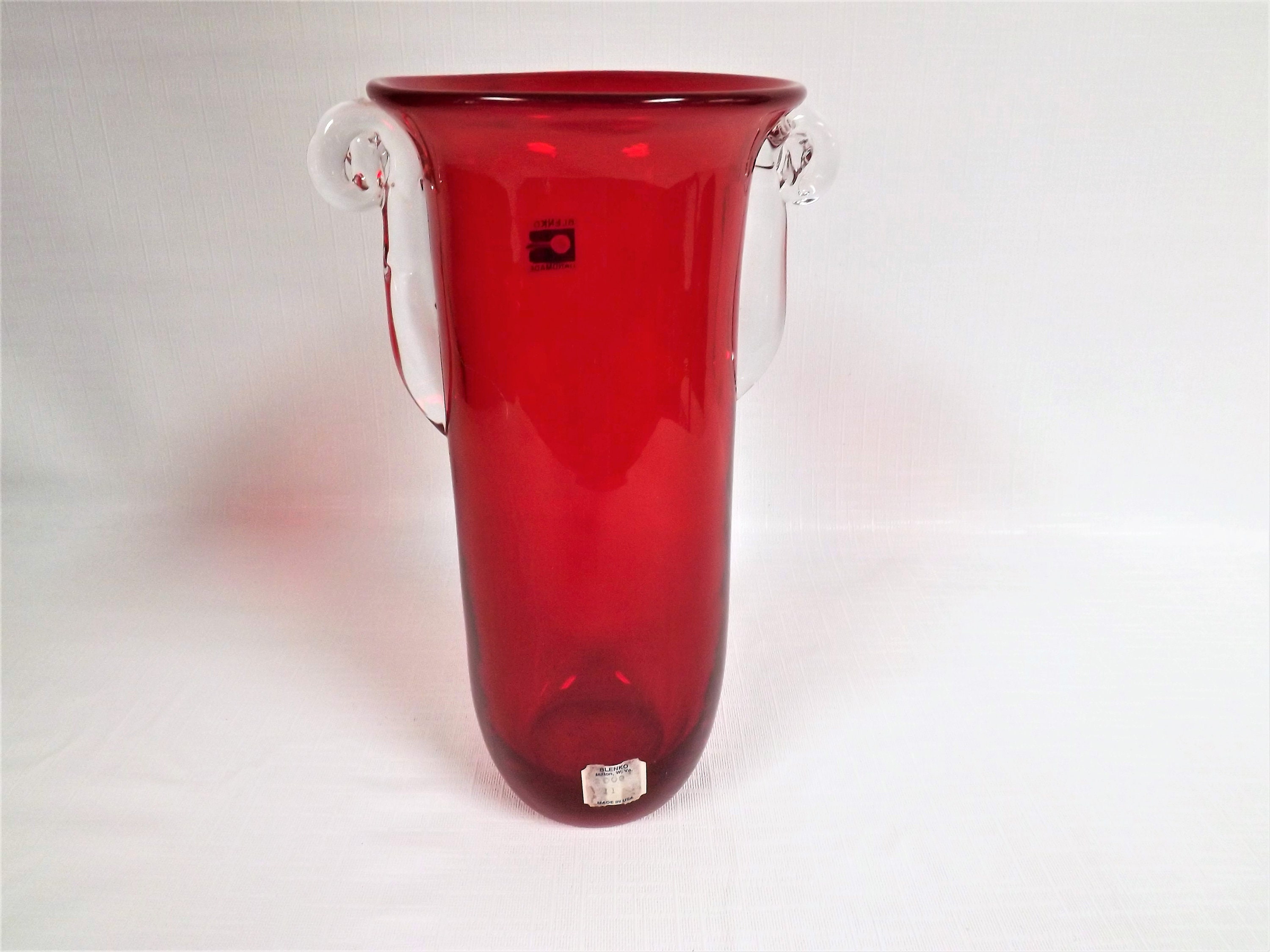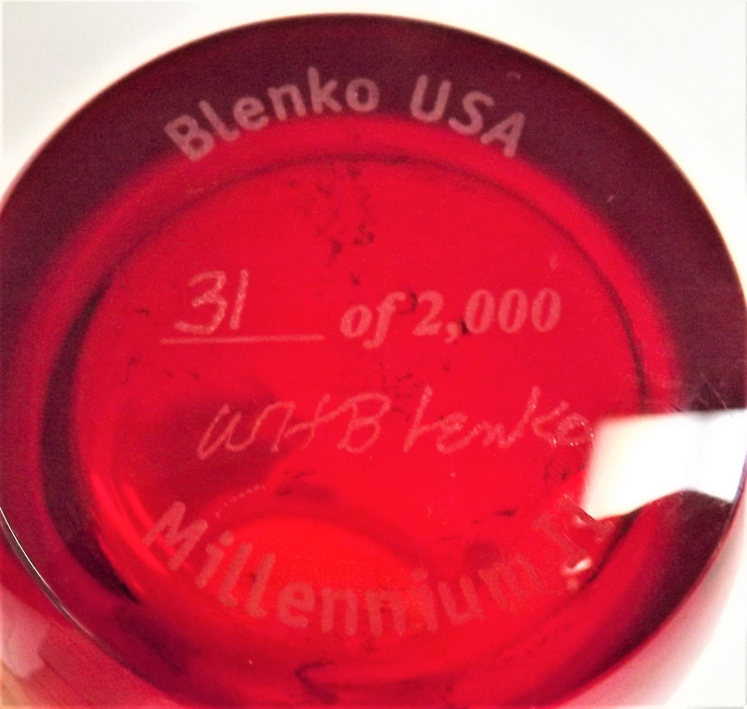 Blenko Glass Ruby Red Millennium II Vase. Designed by Matt Carter. The Blenko sticker and catalog tag are still attached. The bottom is ground and polished. The vase is numbered #31 of 2000 and signed by WH Blenko. It is 8 1/2 inches tall. The Millennium hang tag is included. There are no chips, cracks or other issues.