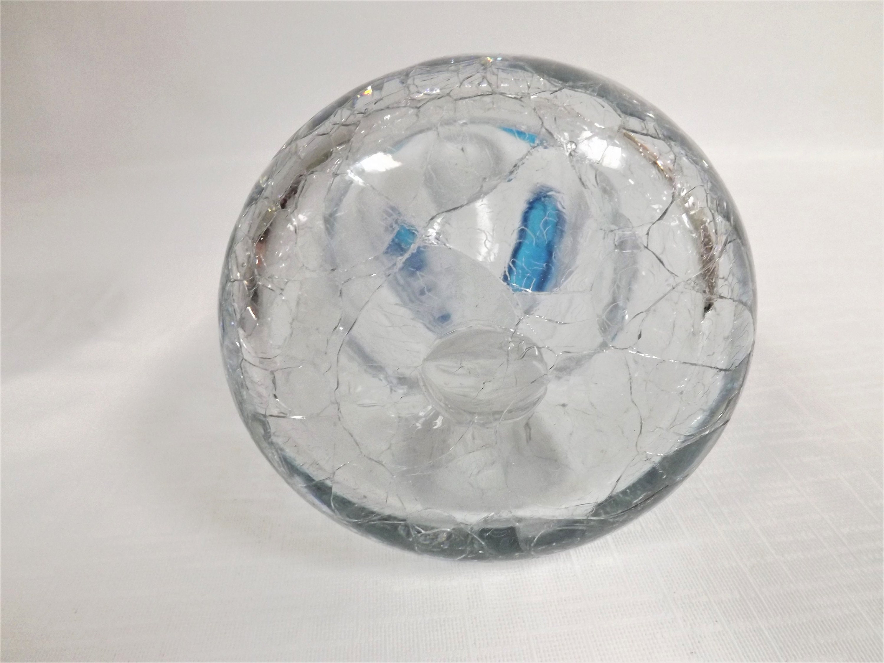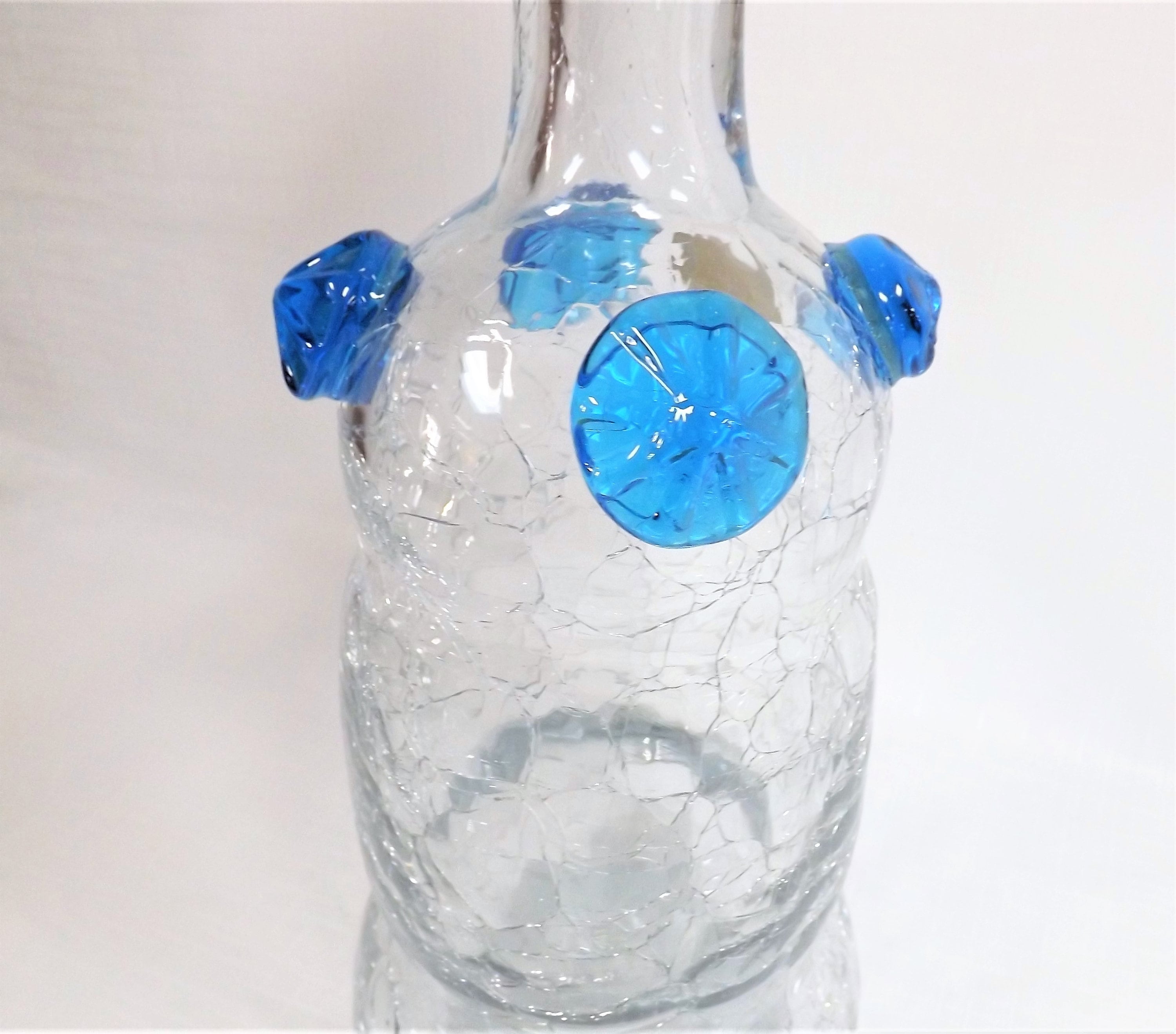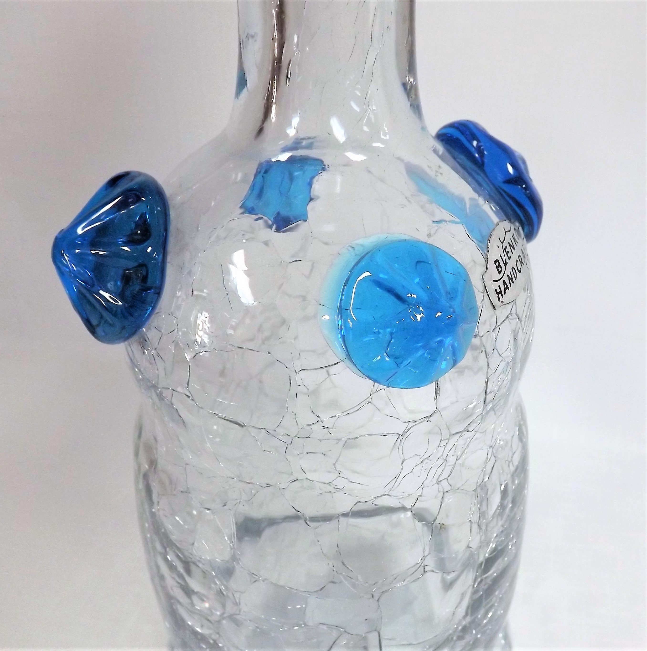 Blenko Glass #6821 Crystal Crackle with Turquoise Decanter. Designed by Joel Myers and added to the catalog line in 1968. This decanter was produced in crystal only with colored decorations. The foil sticker is attached. The pontil mark is fire polished. It is 11 inches tall without the stopper and almost 14 inches tall with the stopper. There are no chips, cracks, or staining.