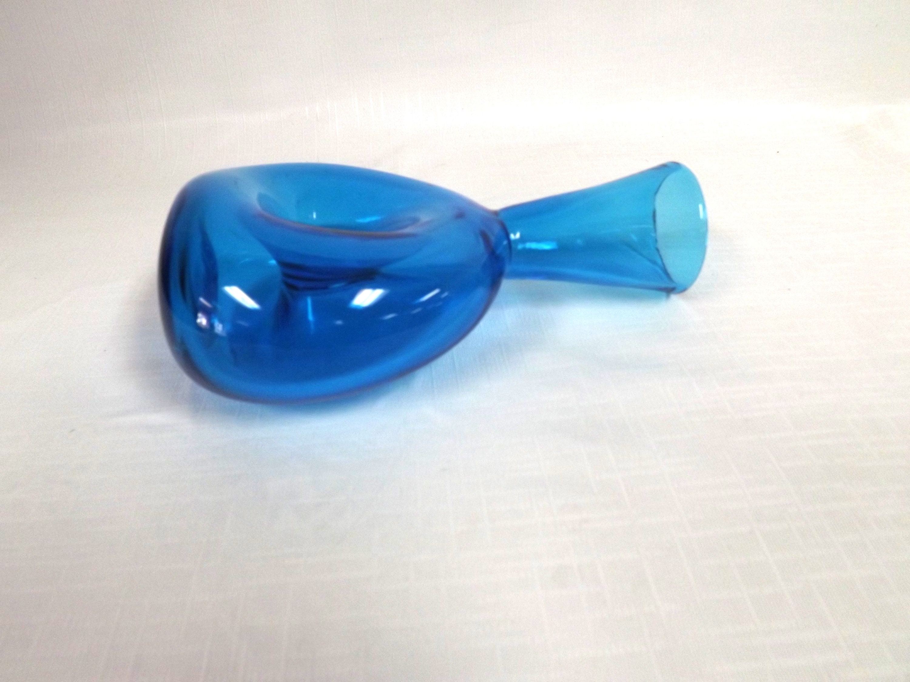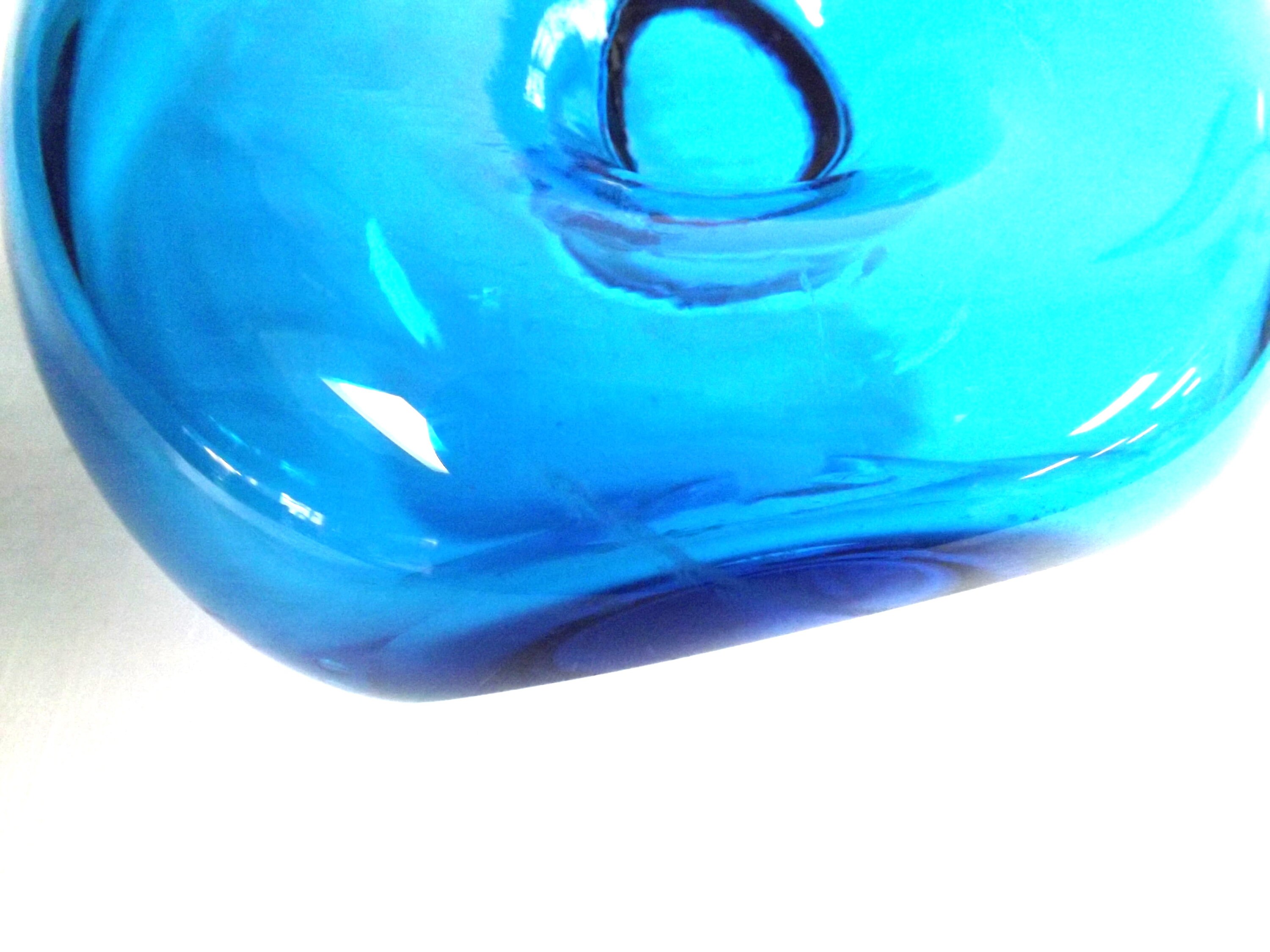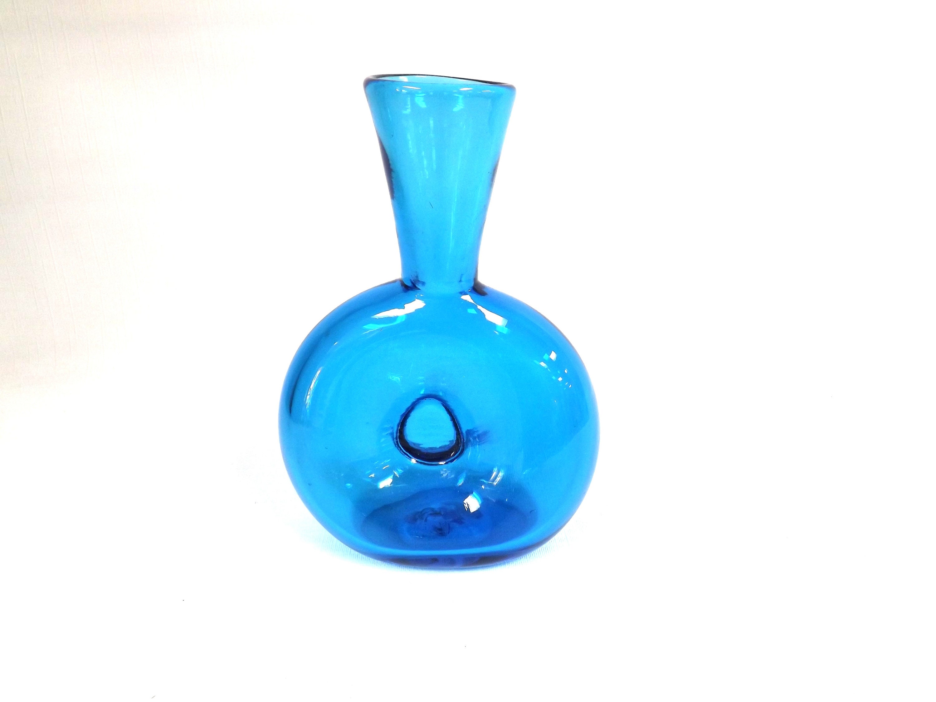 Blenko Glass Turquoise Blue #441-S Doughnut Bottle. This is an early pre-designer design from the 1940's and early 1950's. It is 7 1/4 inches tall and about 5 inches at the widest part. There are no chips, cracks, or water damage, but there is a slight scuff mark at the bottom of the bottle. The bottom has been partially ground and polished, but the pontil mark is rough.