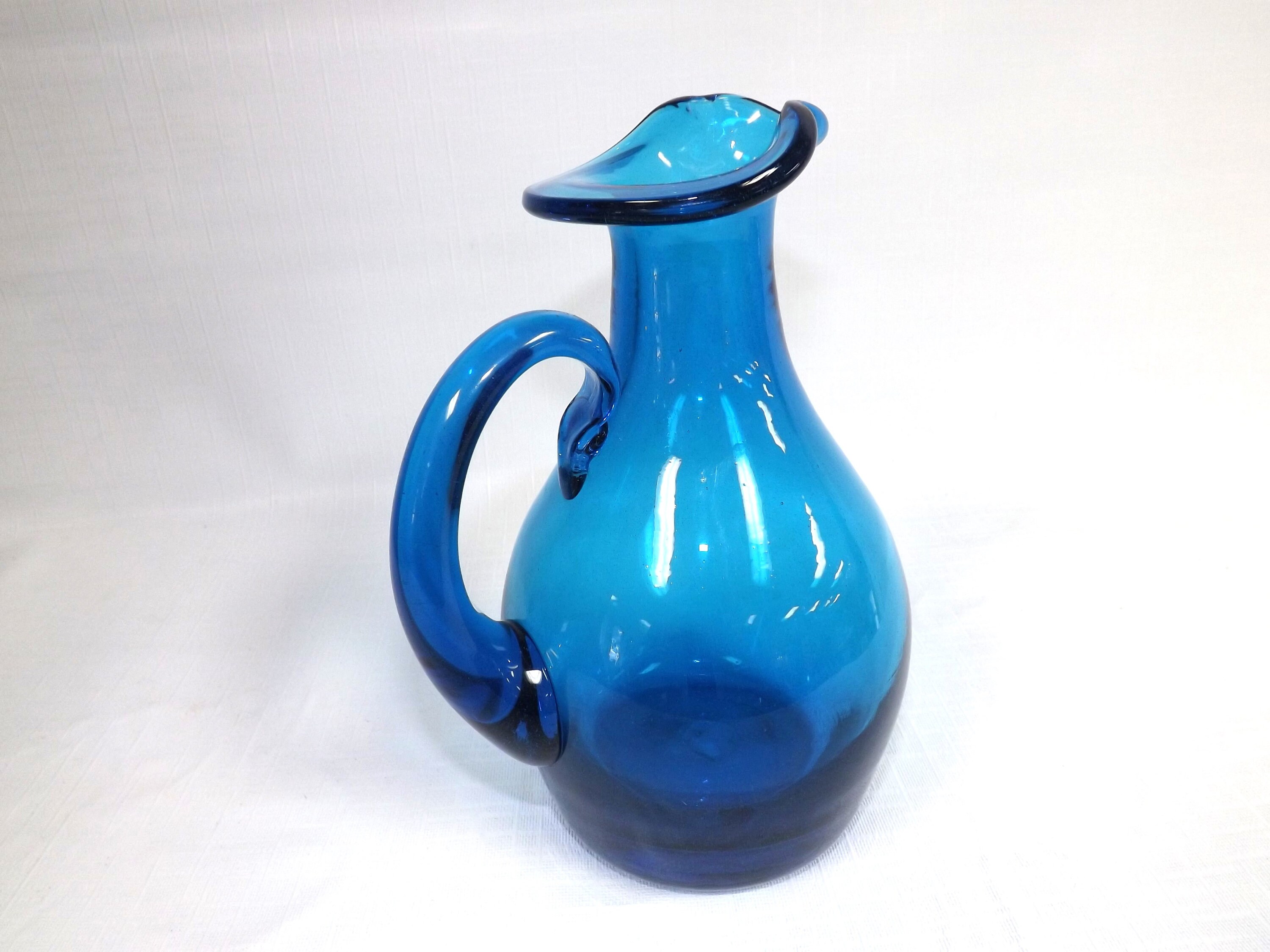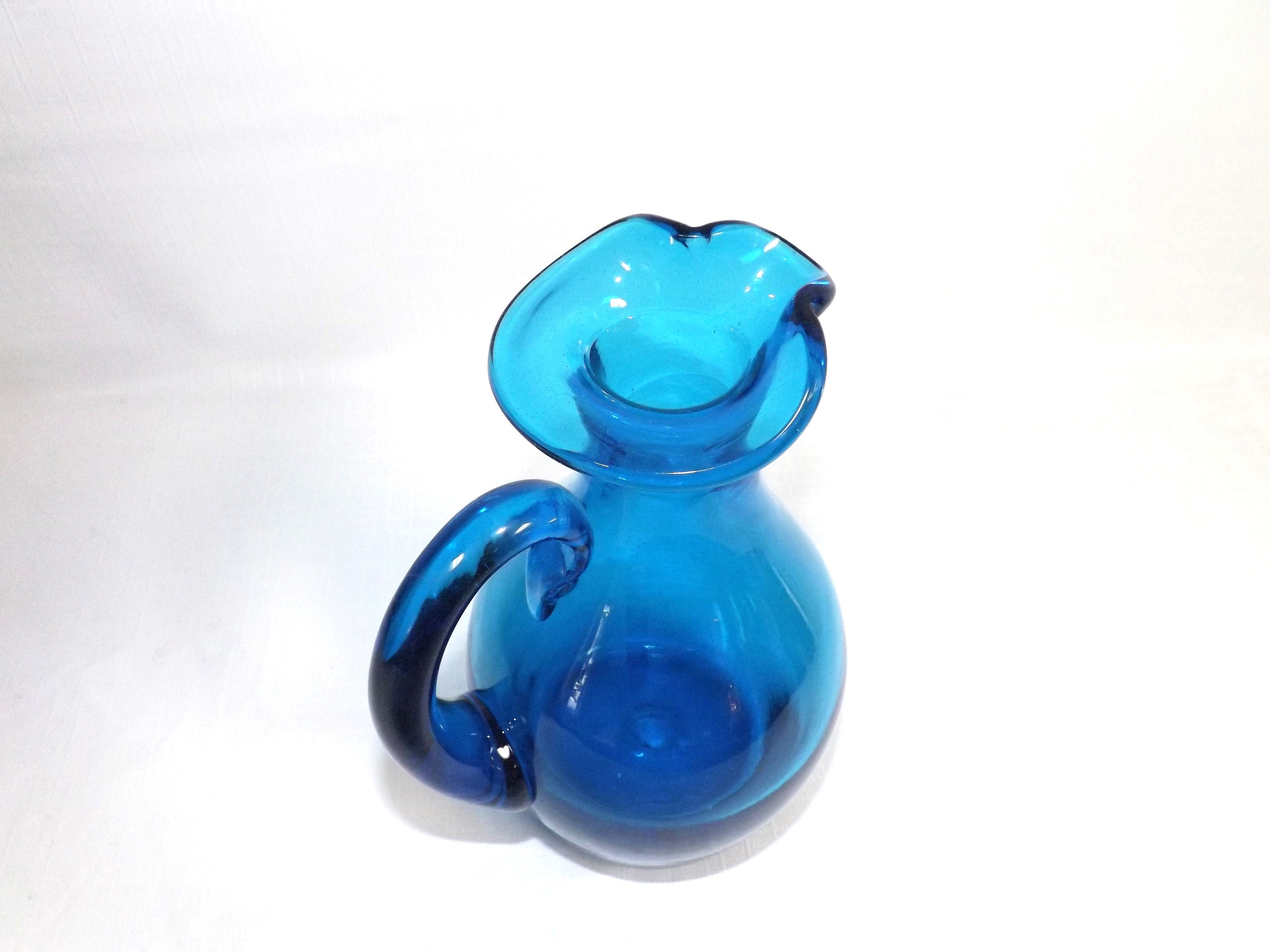 Blenko Glass Turquoise Blue #7523 Pitcher. Designed by John Nickerson and added to the line in 1975. The pitcher is about 7 1/4 inches tall and about 4 1/2 inches at the widest part. There is a very thin, light swirl line in the glass. The pontil mark is fire polished. There are no chips, cracks, or water damage.