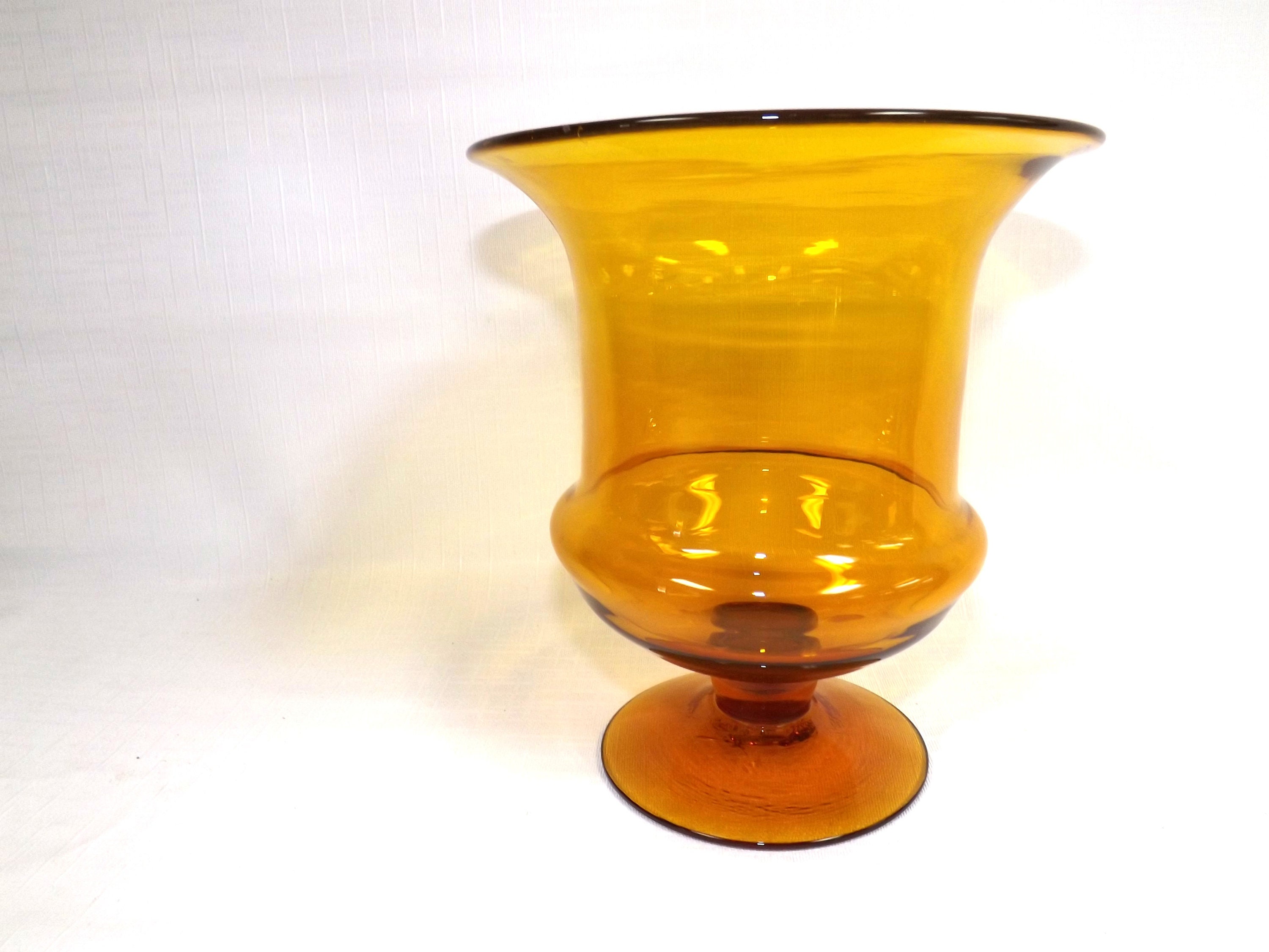 Blenko Glass Gold #428-S Vase Pre-designer. This design was added to the catalog in 1941, but produced in gold in 1955-1957. It's about 7 1/4 inches tall and about 6 1/2 inches across the top. It has a fire polished pontil mark. There are no chips cracks or water damage.