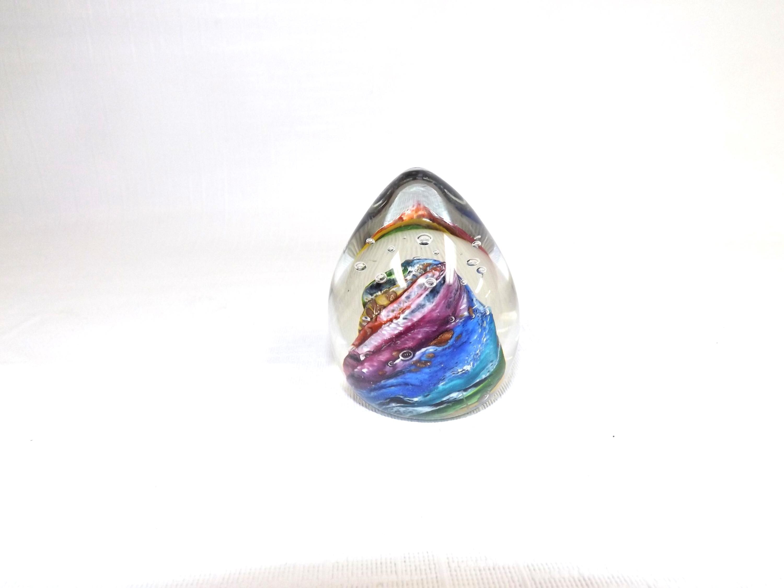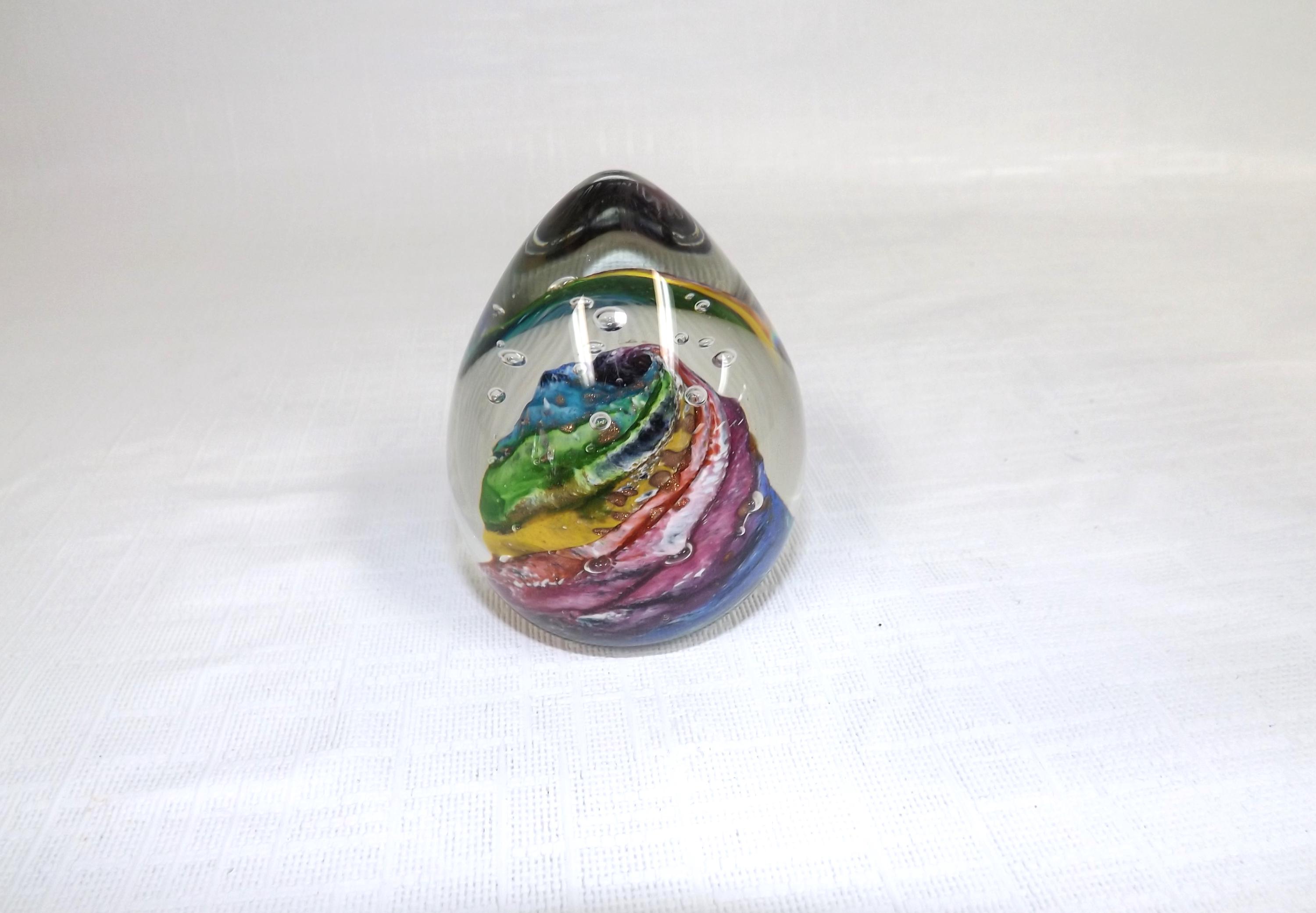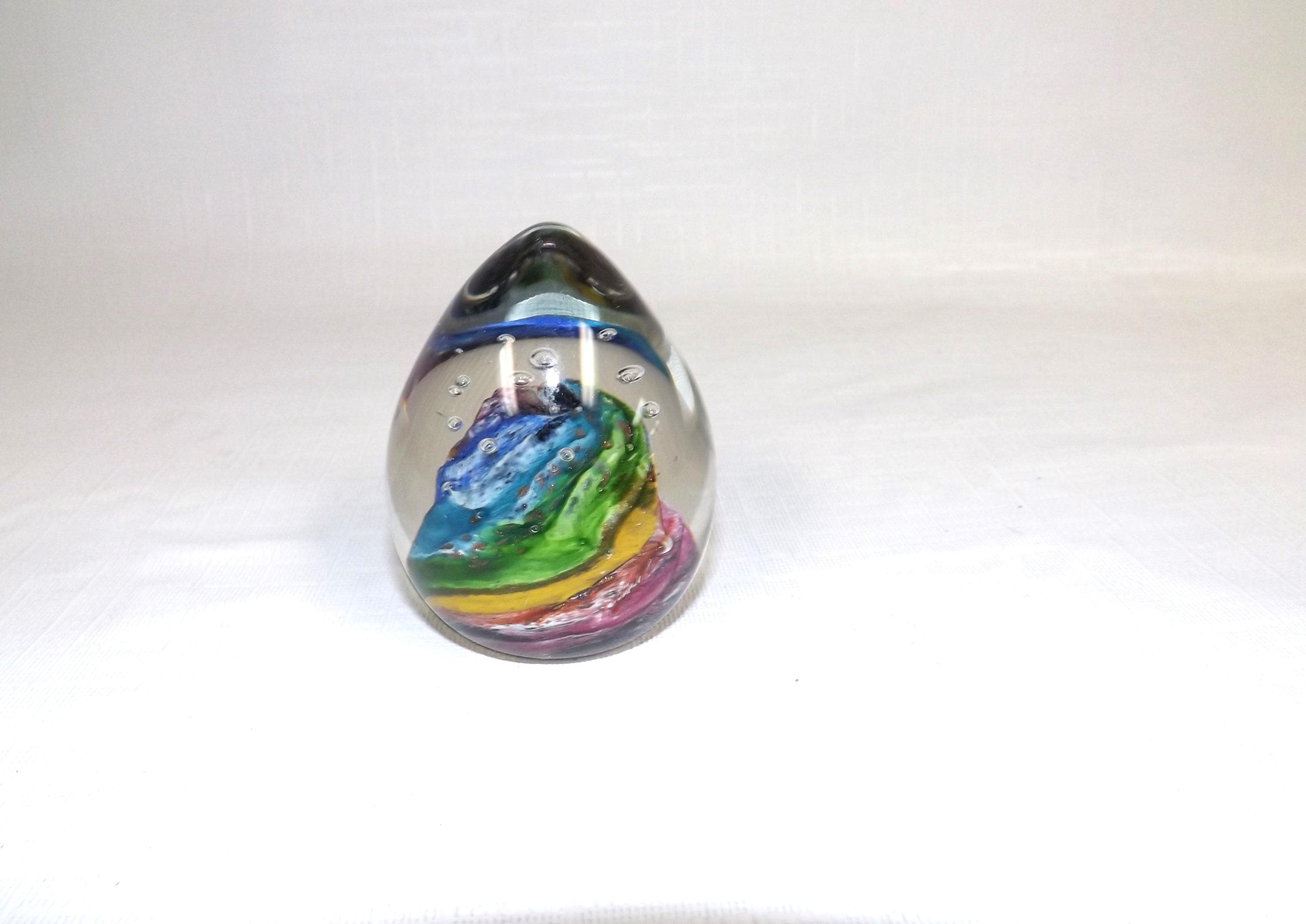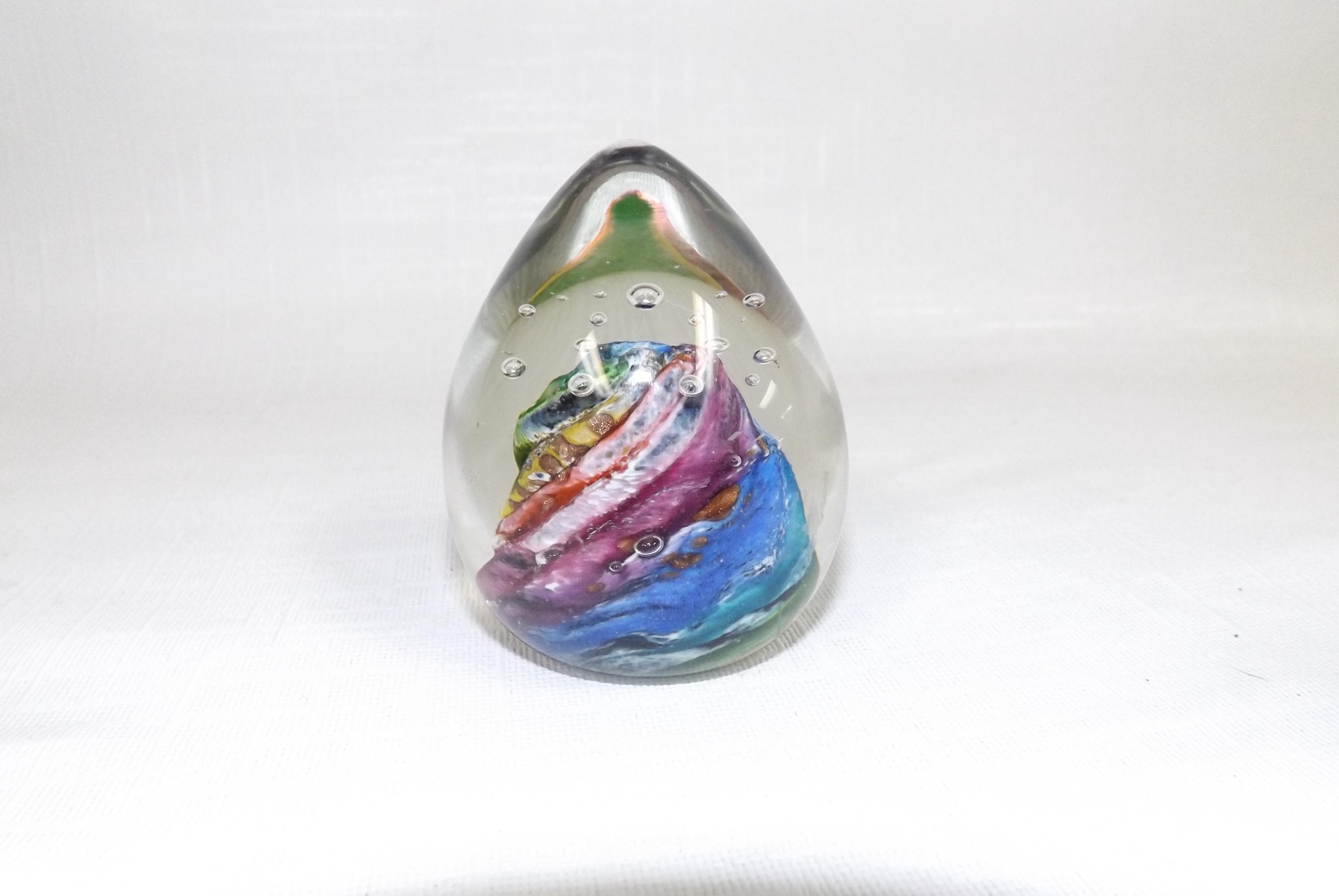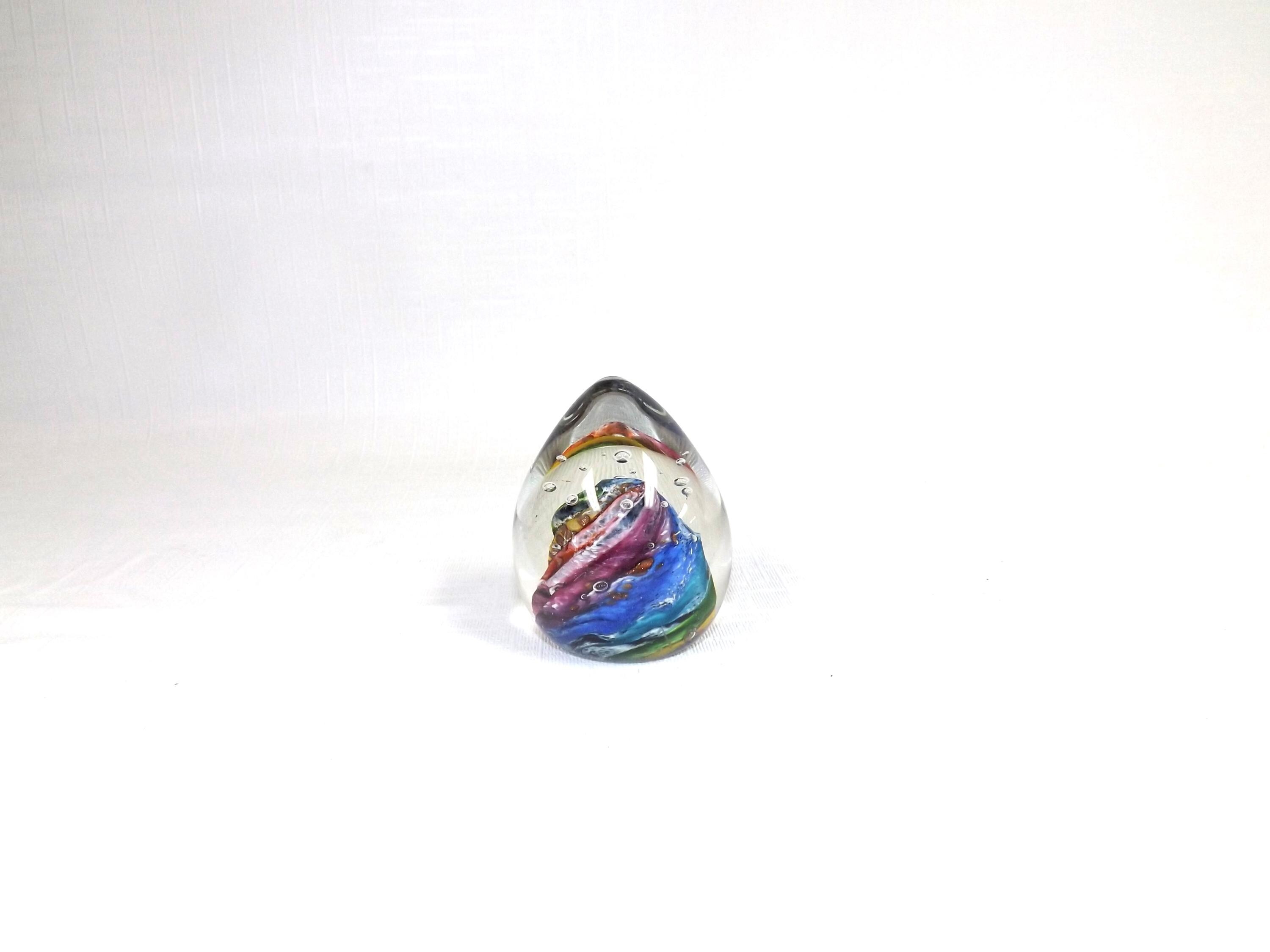Marilyn Kimble Holt hand made glass multi-color paperweight, made in West Virginia. The weight has a rainbow of colors filled with air bubbles.It is egg shaped.