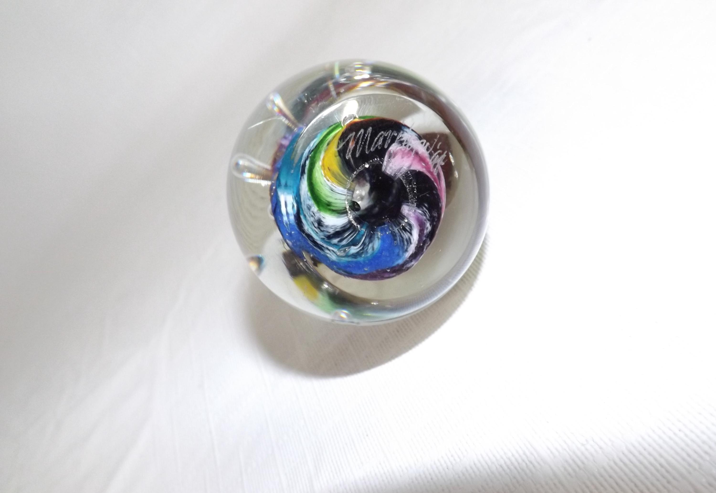 Marilyn has been making glass since 1989. It is 2 3/4 inches tall and about 2 1/4 inches at the widest part. It is signed "Marilyn" on the polished bottom. There are no chips, cracks, or other issues.