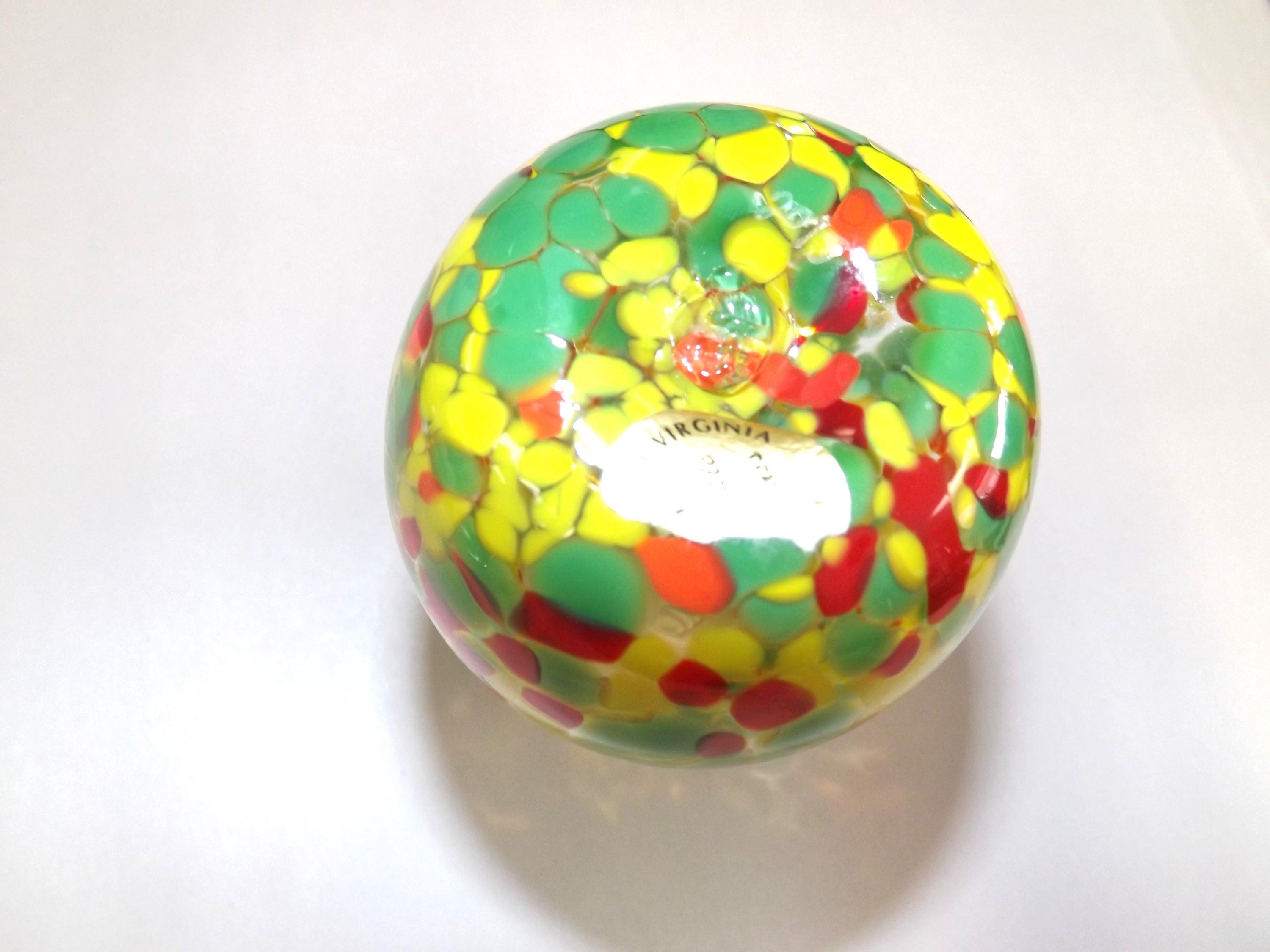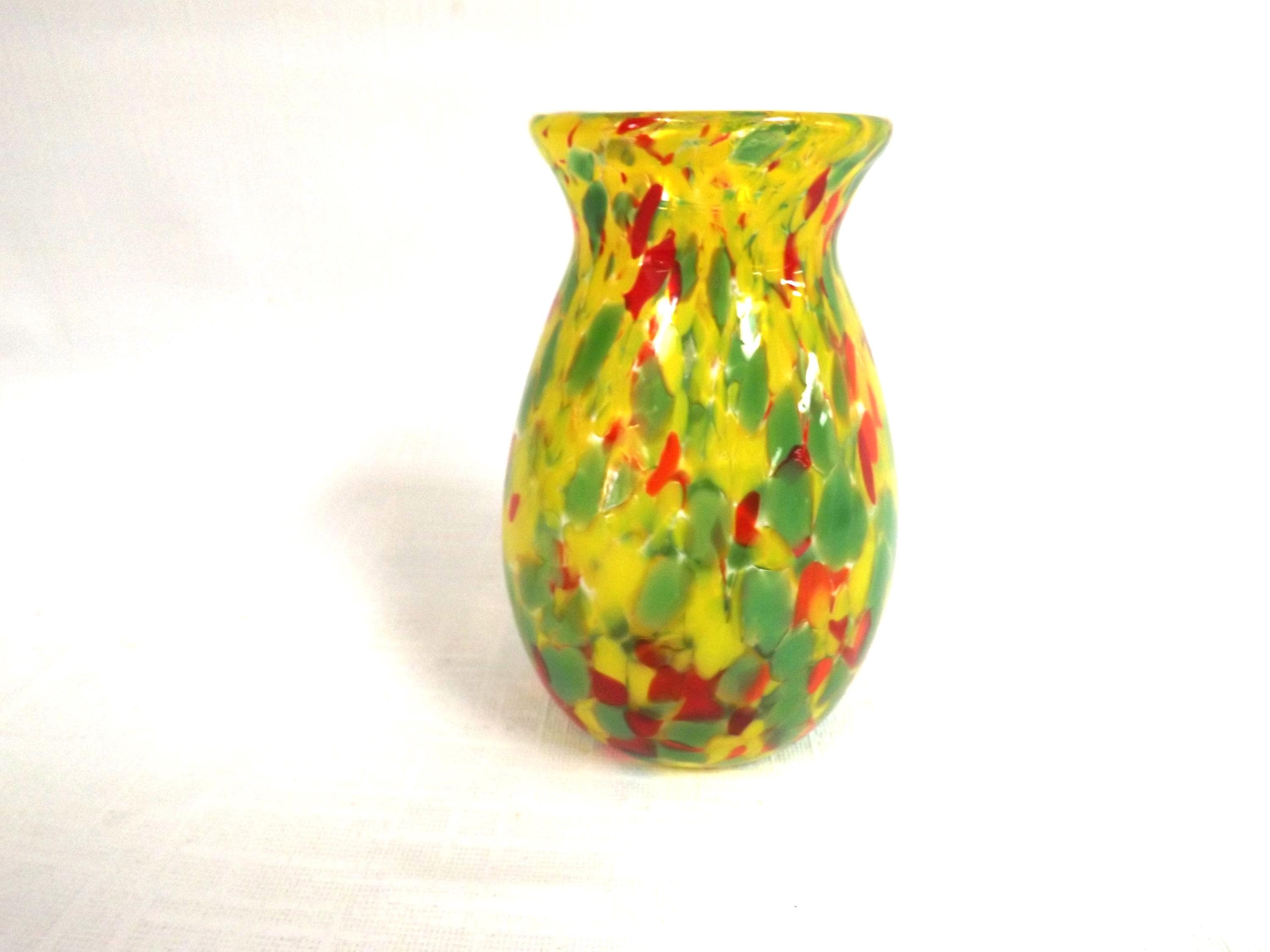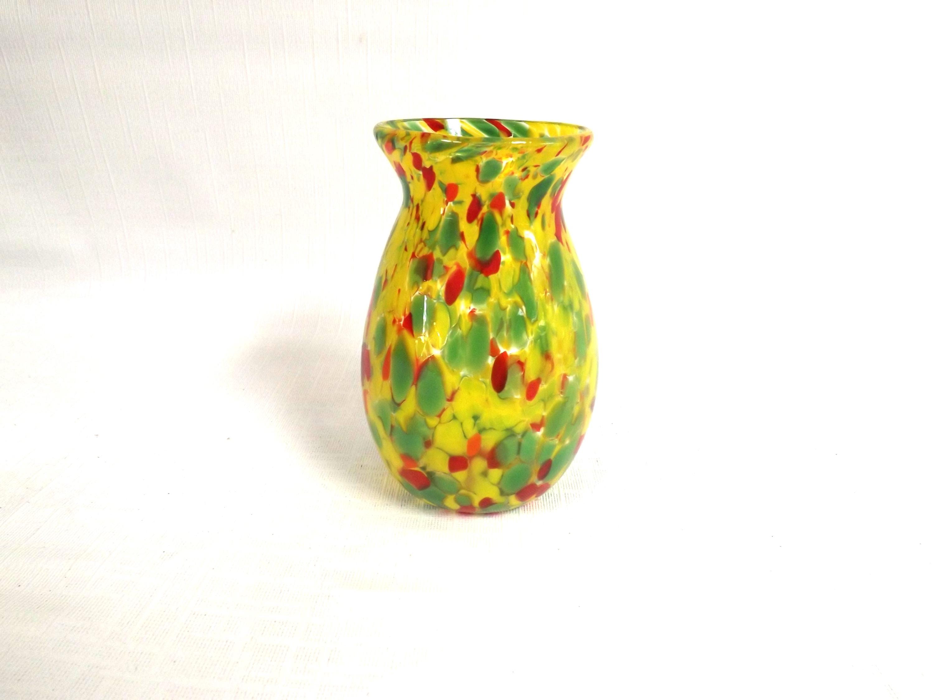 Ron Hinkle Glass Multi-color Child's Vase Signed Handblown WV. The small bud vase is crystal rolled in yellow, green, and red frit. It's about 4 1/4 inches tall and about 2 1/2 inches at the widest part. Part of the Hinkle Glass sticker is still attached, It's stamped "RH" on the pontil mark, and dated 2015. There are no condition issues.