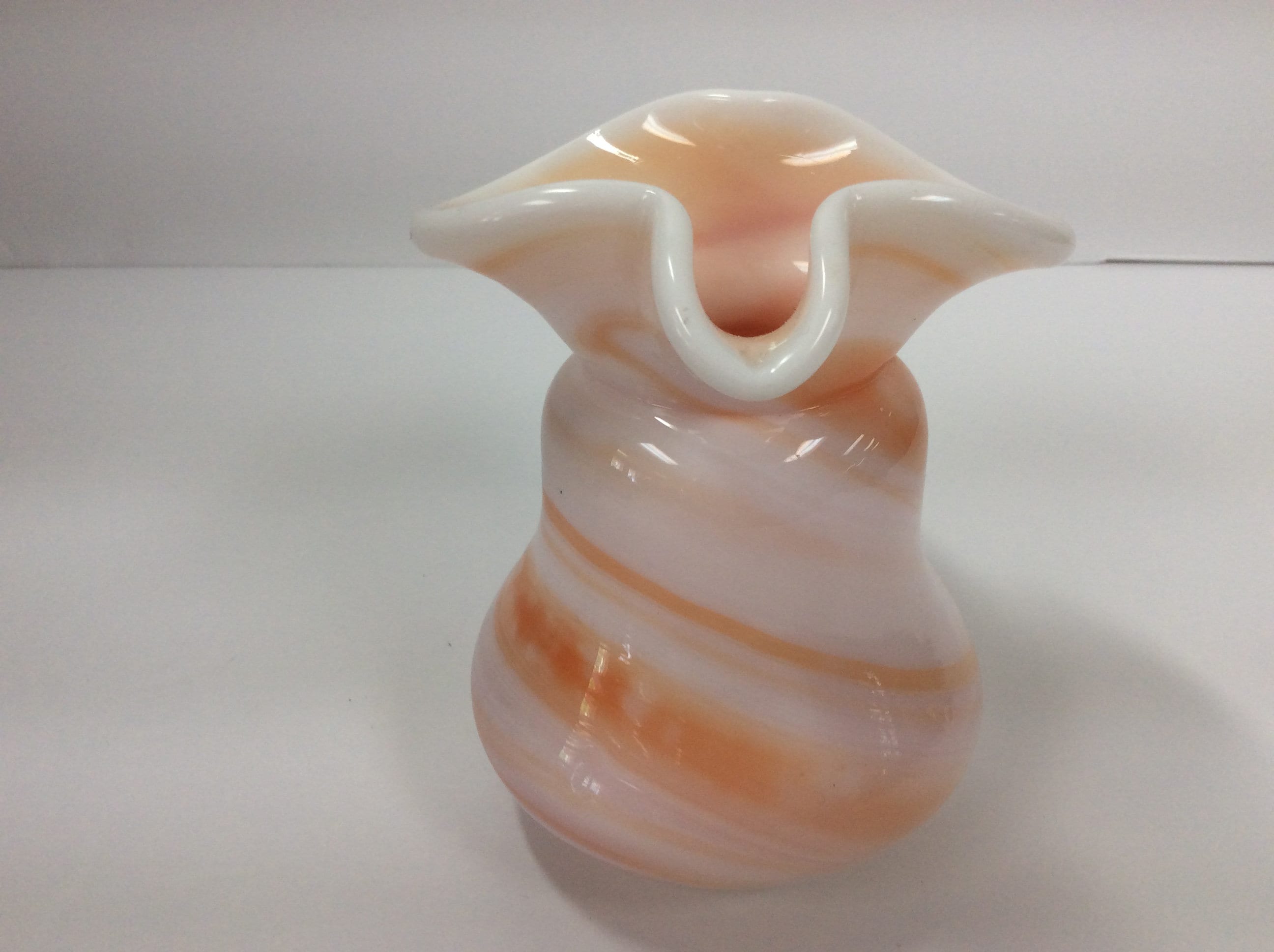 Kanawha Glass slag glass mini pitcher. Item #268ED. Orange, white, and a little bit of yellow.