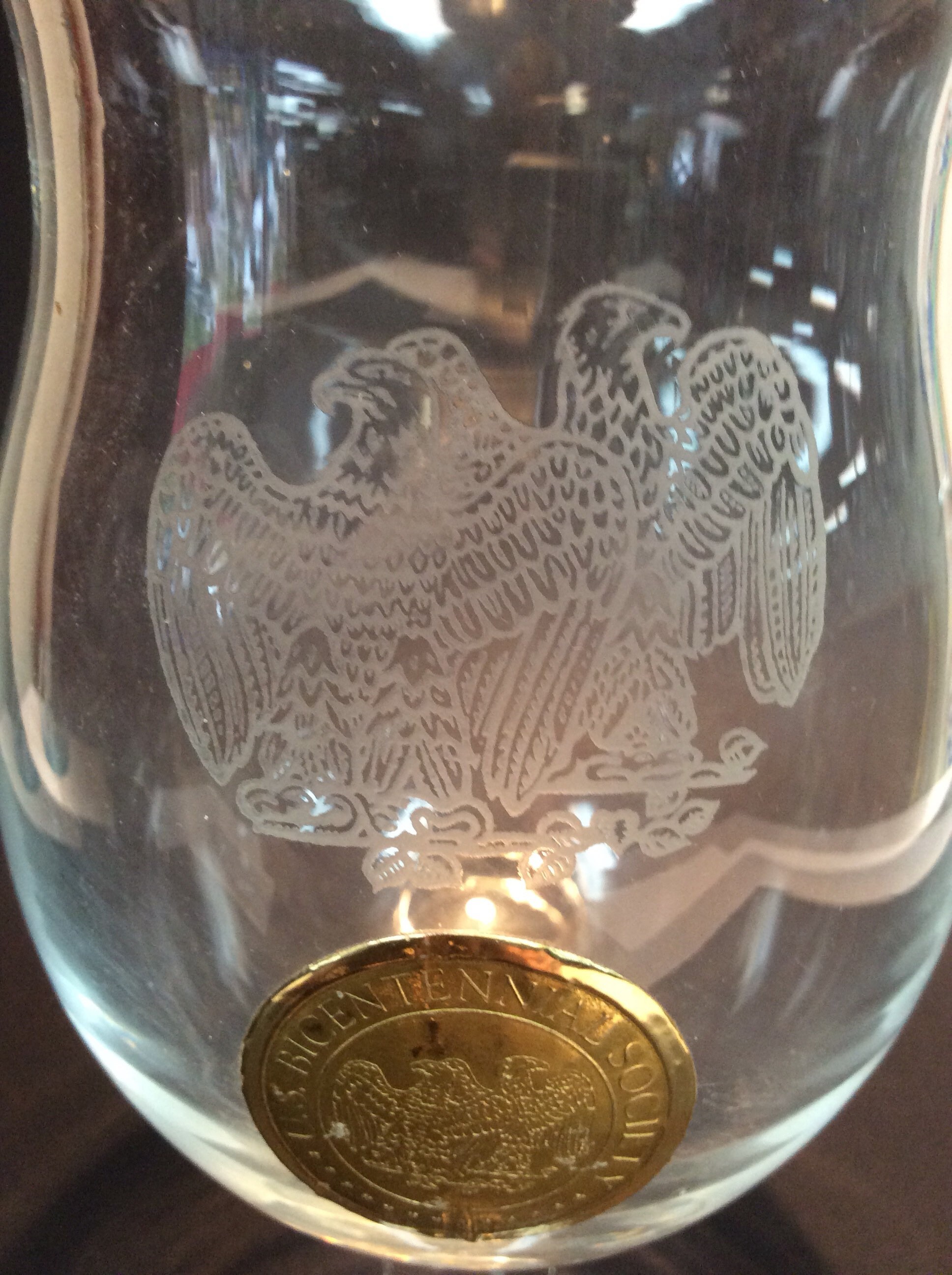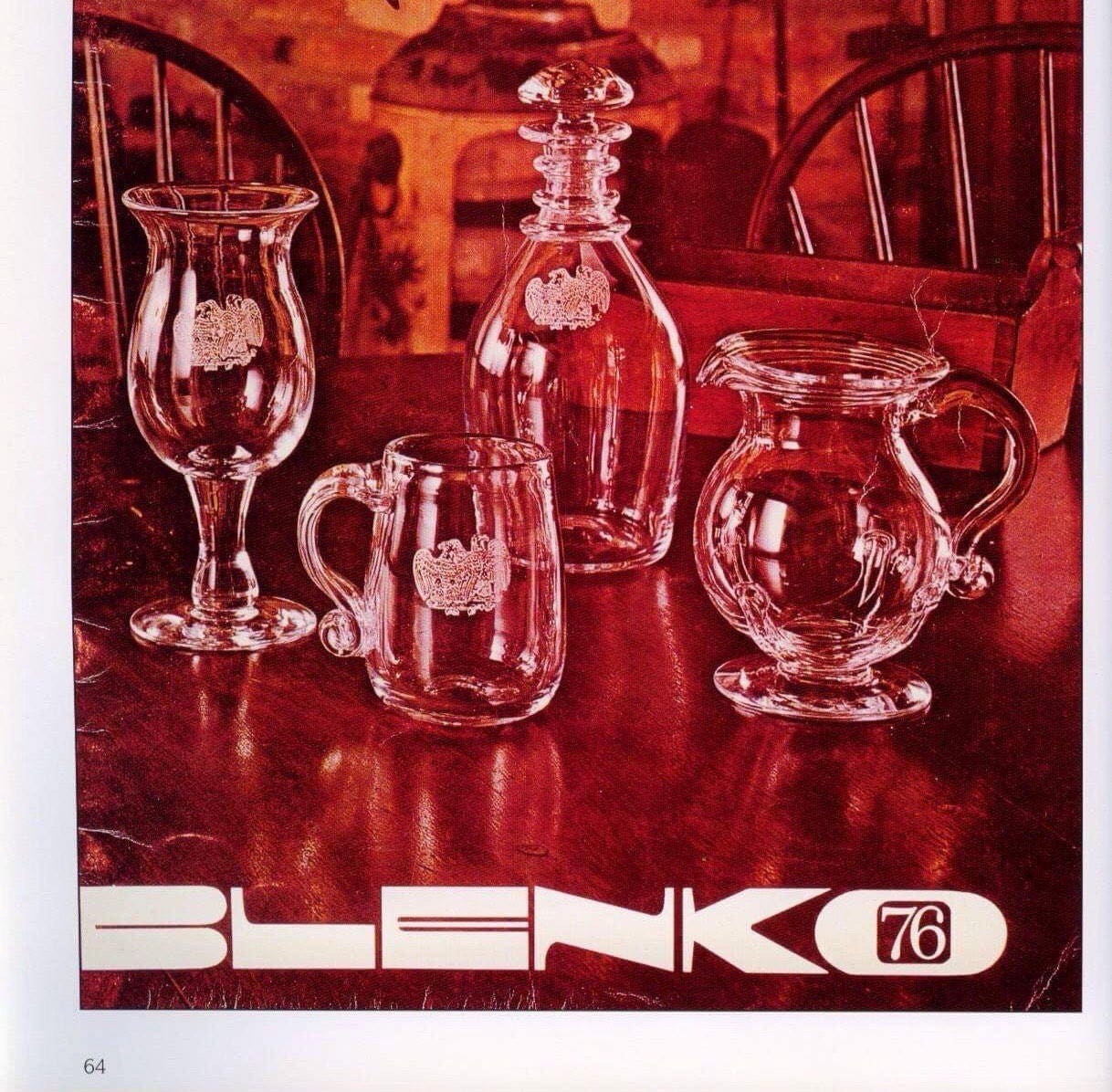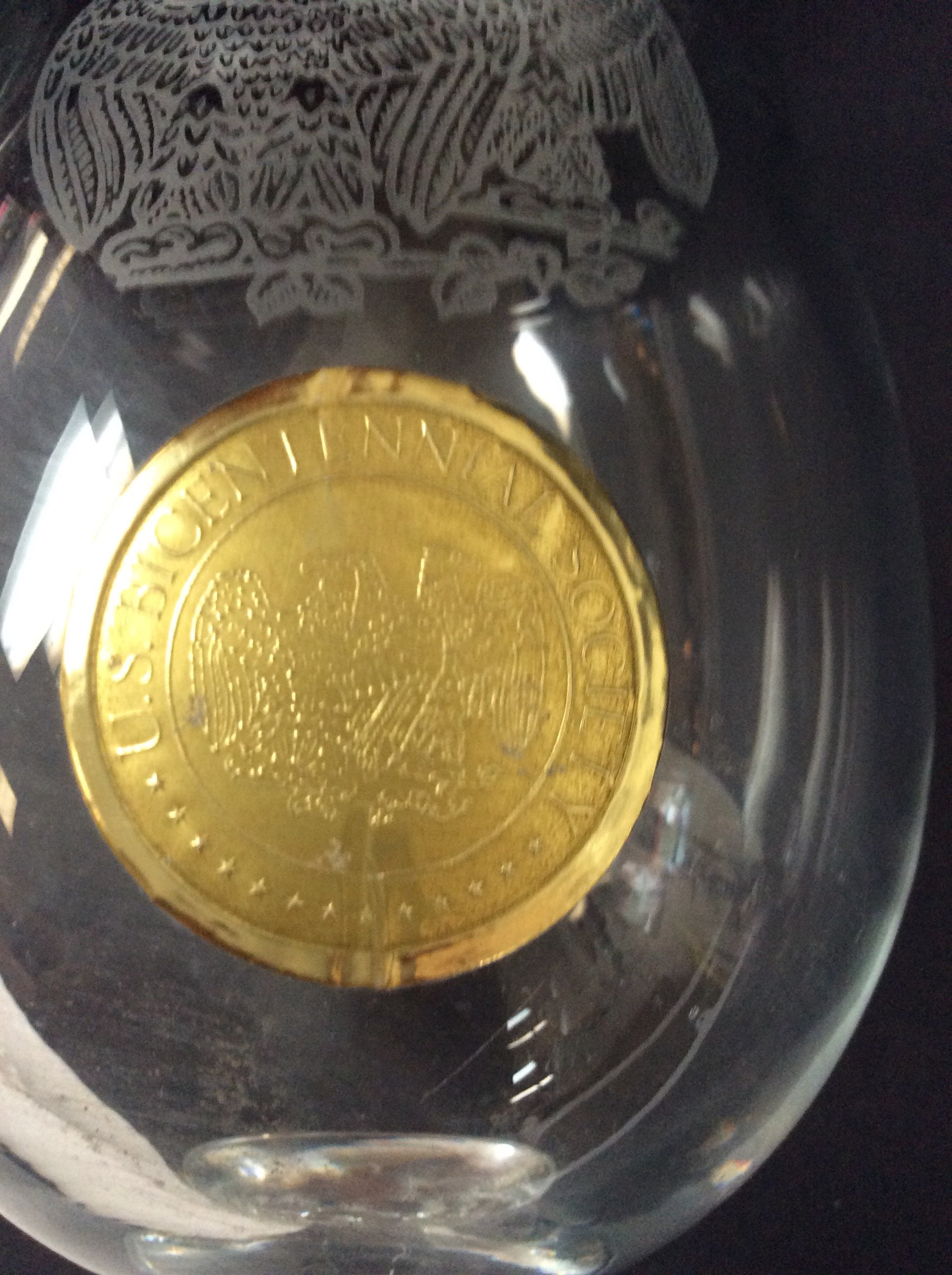 This item was only in the 1976 catalog. It is actually on the cover of the 1976 catalog. It was appointed by the US Bicentennial Society. It has the bicentennial sticker. There are two eagles etched into the side. This is one of very few pieces of Blenko that are etched. The pontil has been polished. Has the US Bicentennial Society sticker.