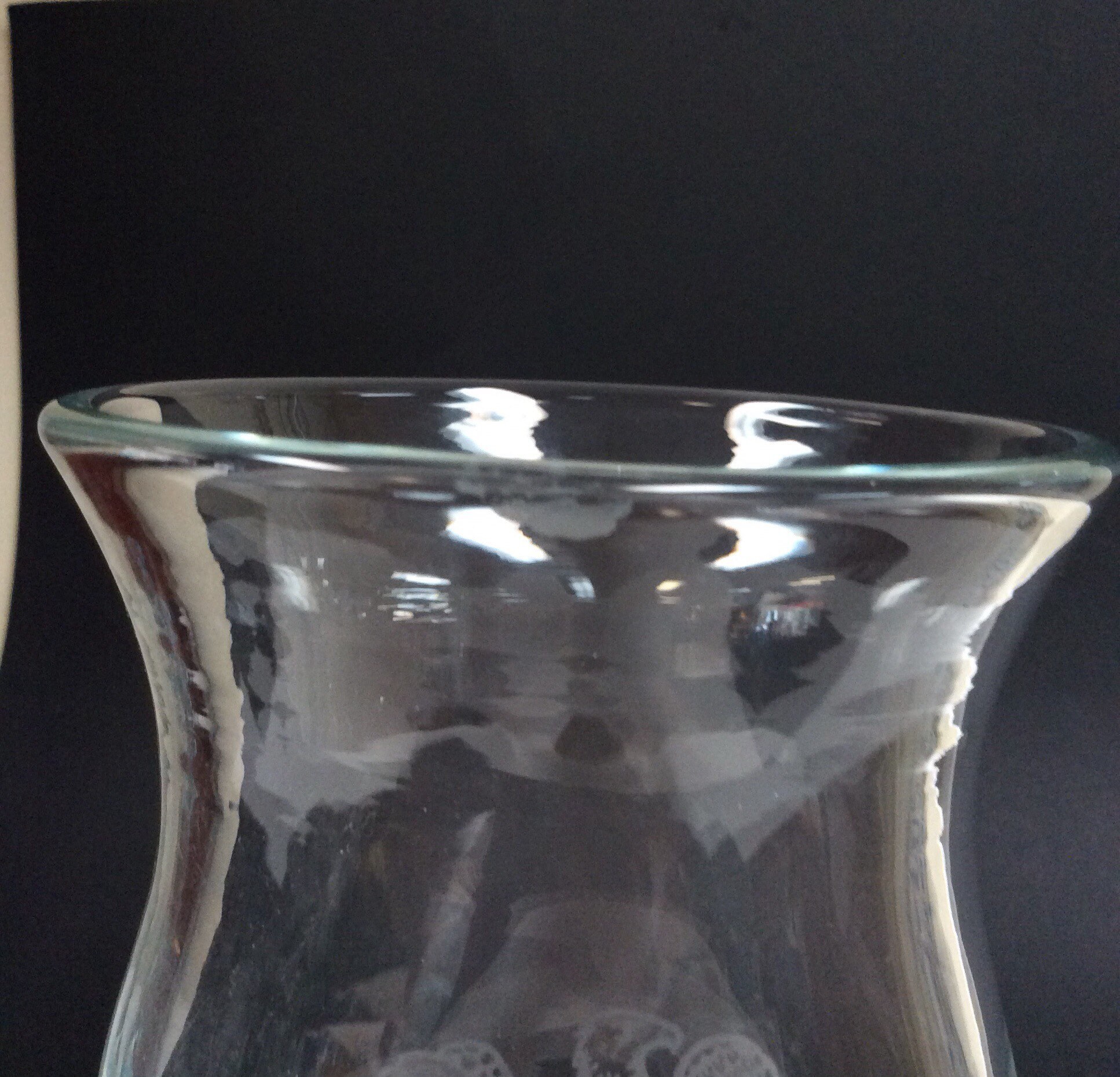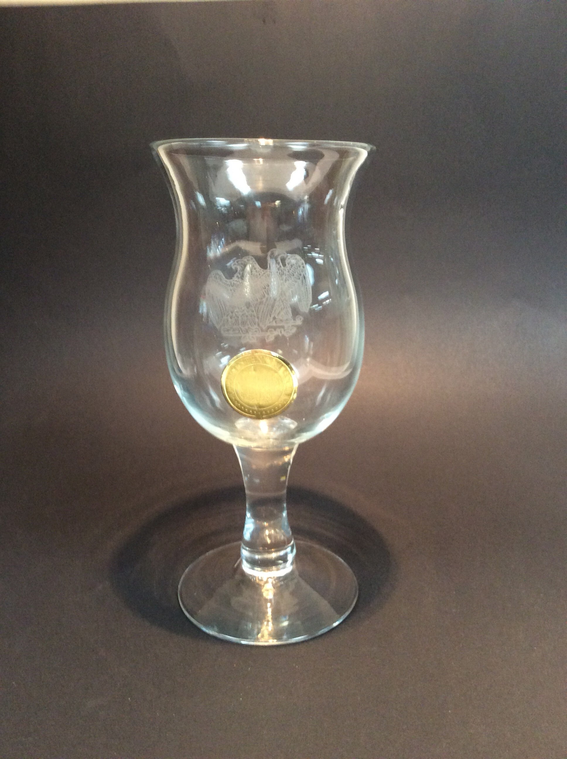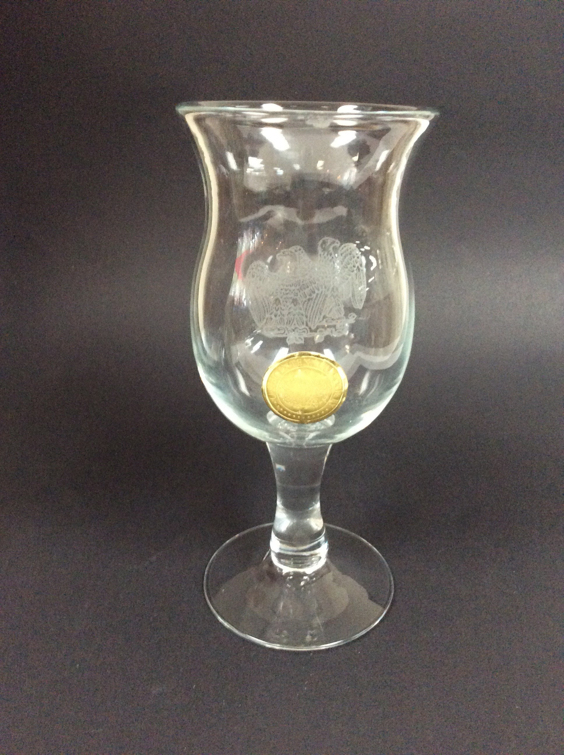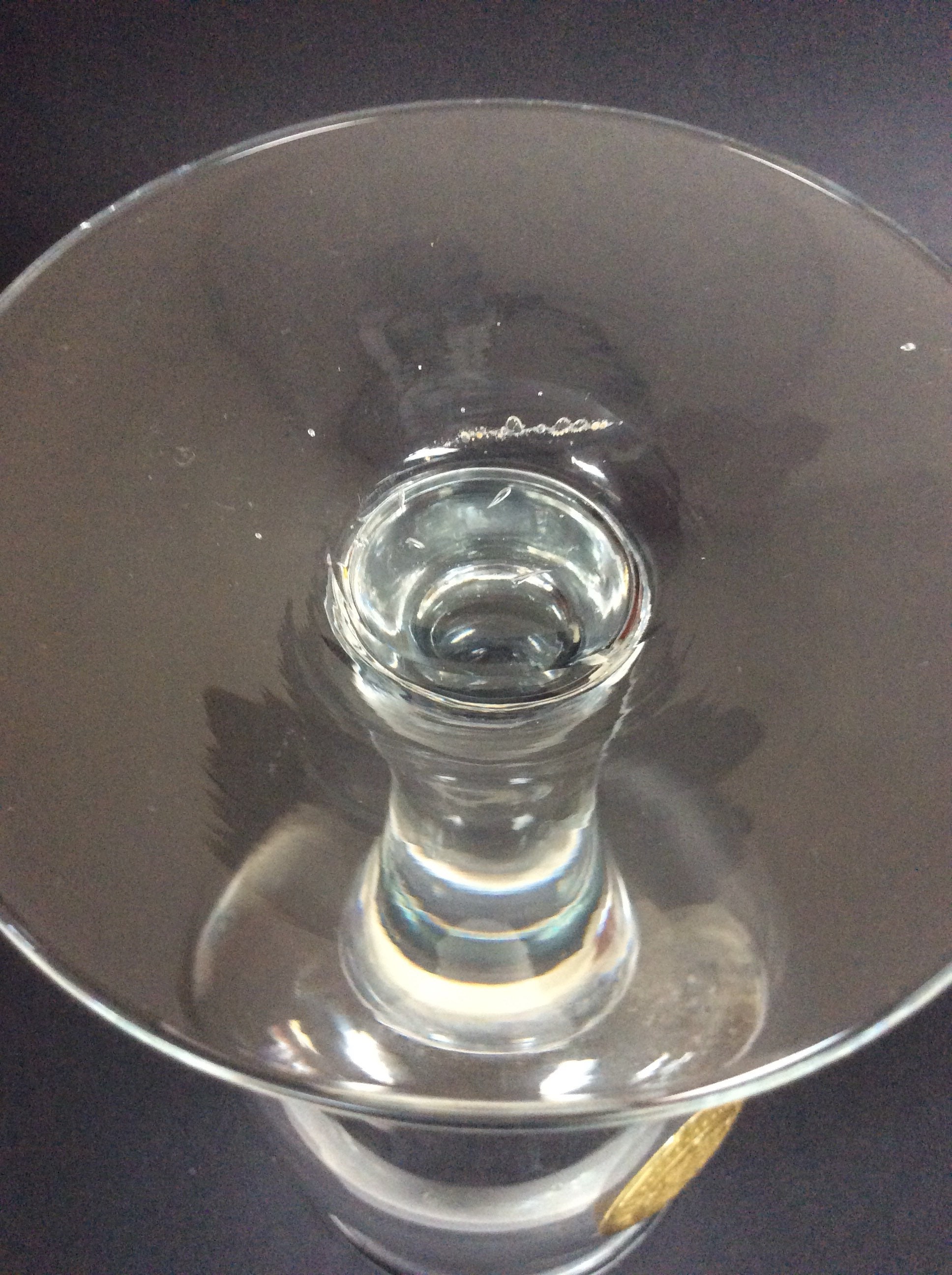 This item was only in the 1976 catalog. It is actually on the cover of the 1976 catalog. It was appointed by the US Bicentennial Society. It has the bicentennial sticker. There are two eagles etched into the side. This is one of very few pieces of Blenko that are etched. The pontil has been polished. Has the US Bicentennial Society sticker.