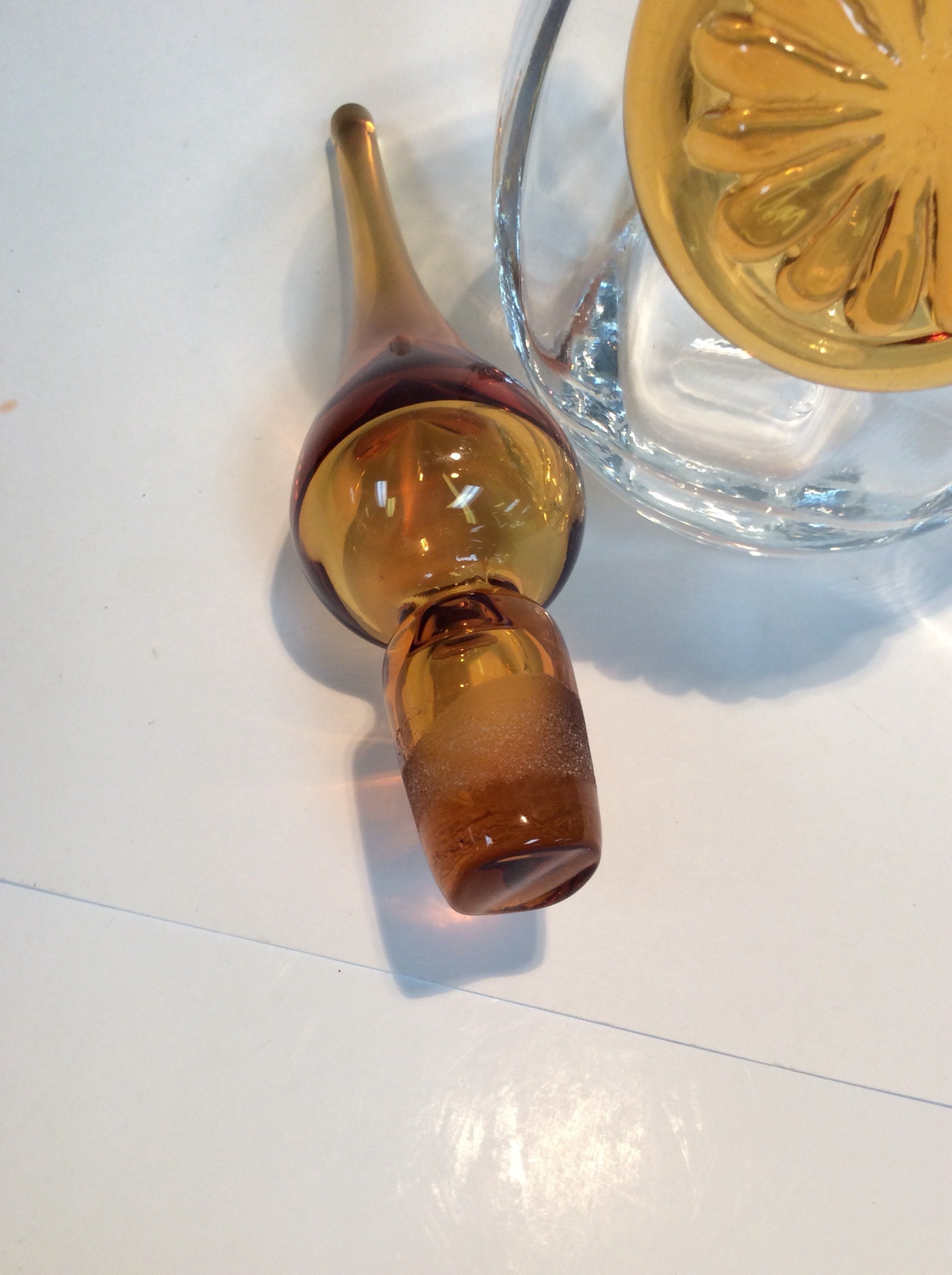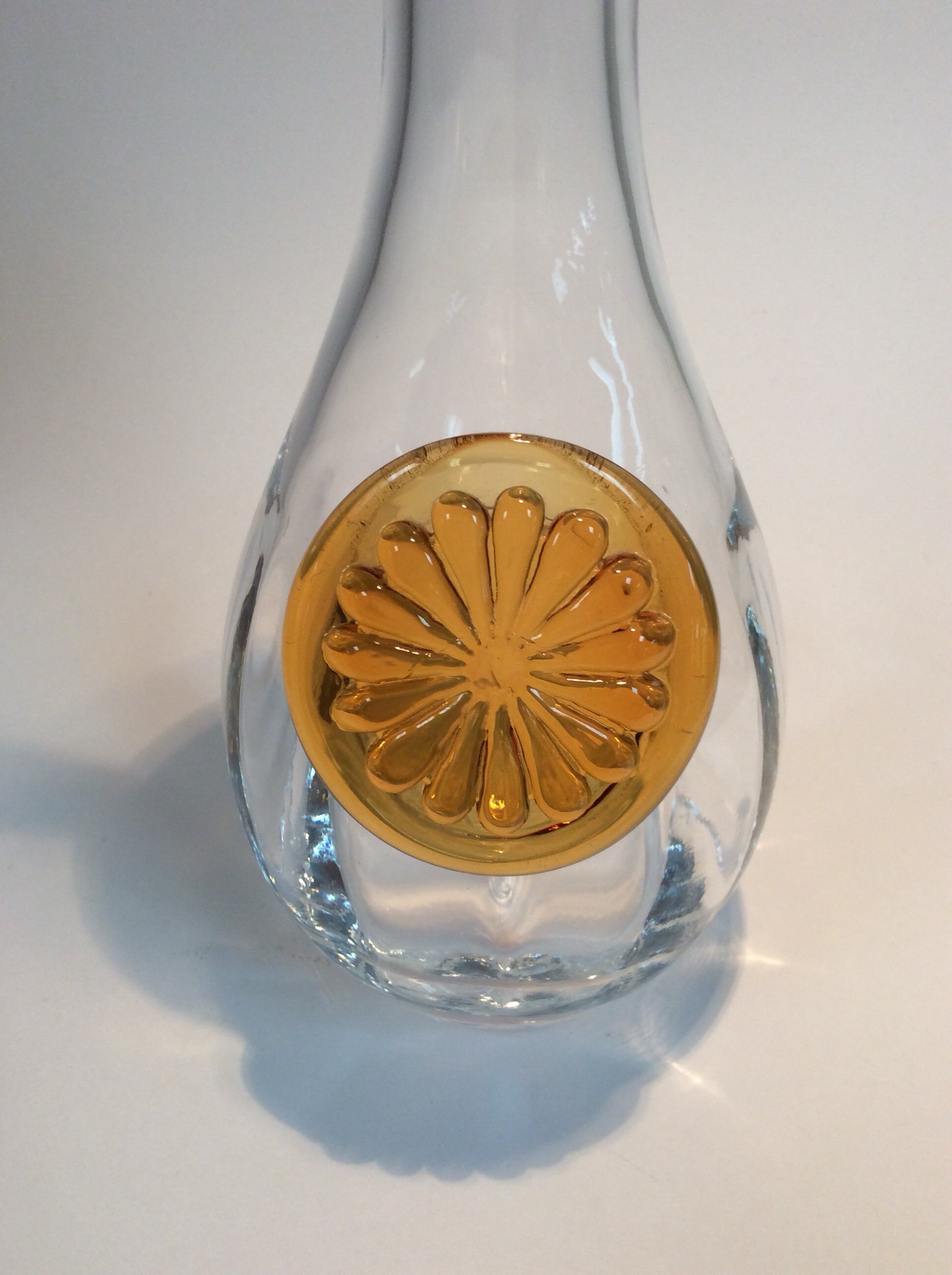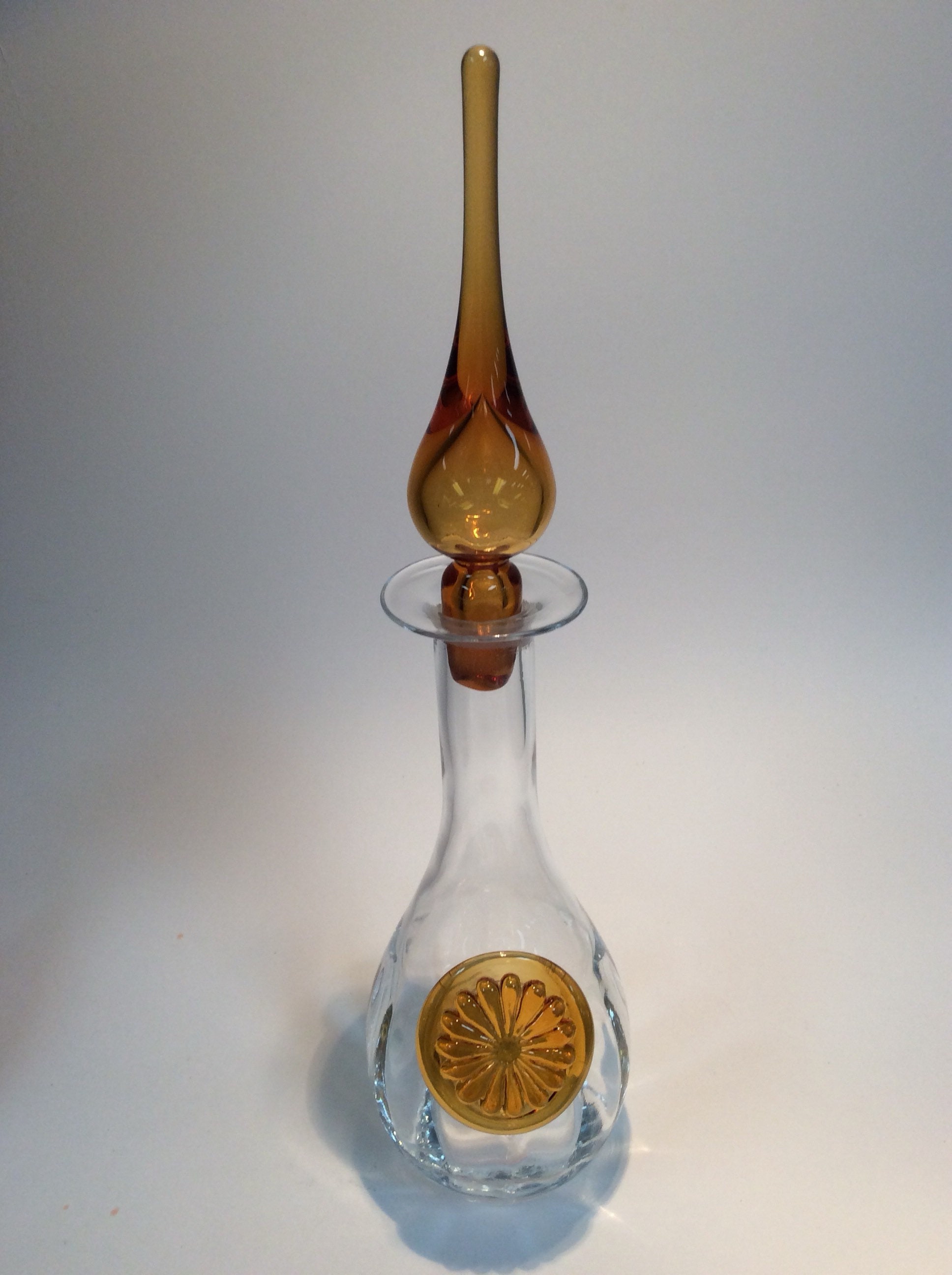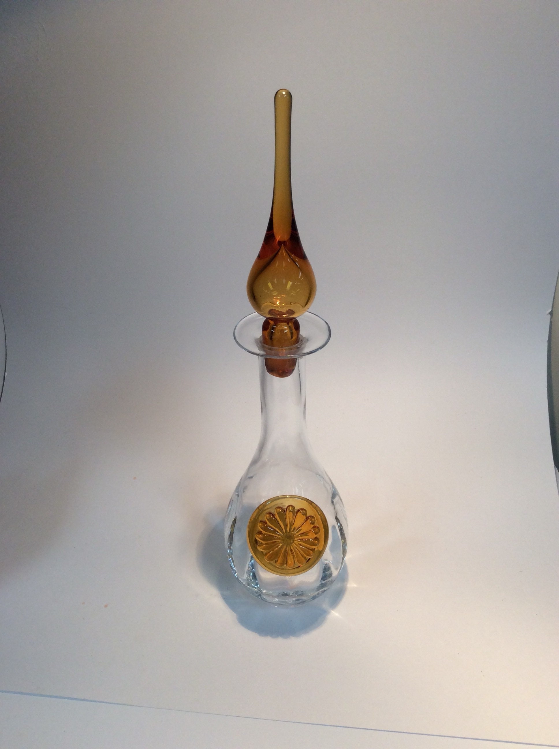Hand blown decanter C338 from Rainbow Glass company. Crystal with amber stopper and applied medallion.