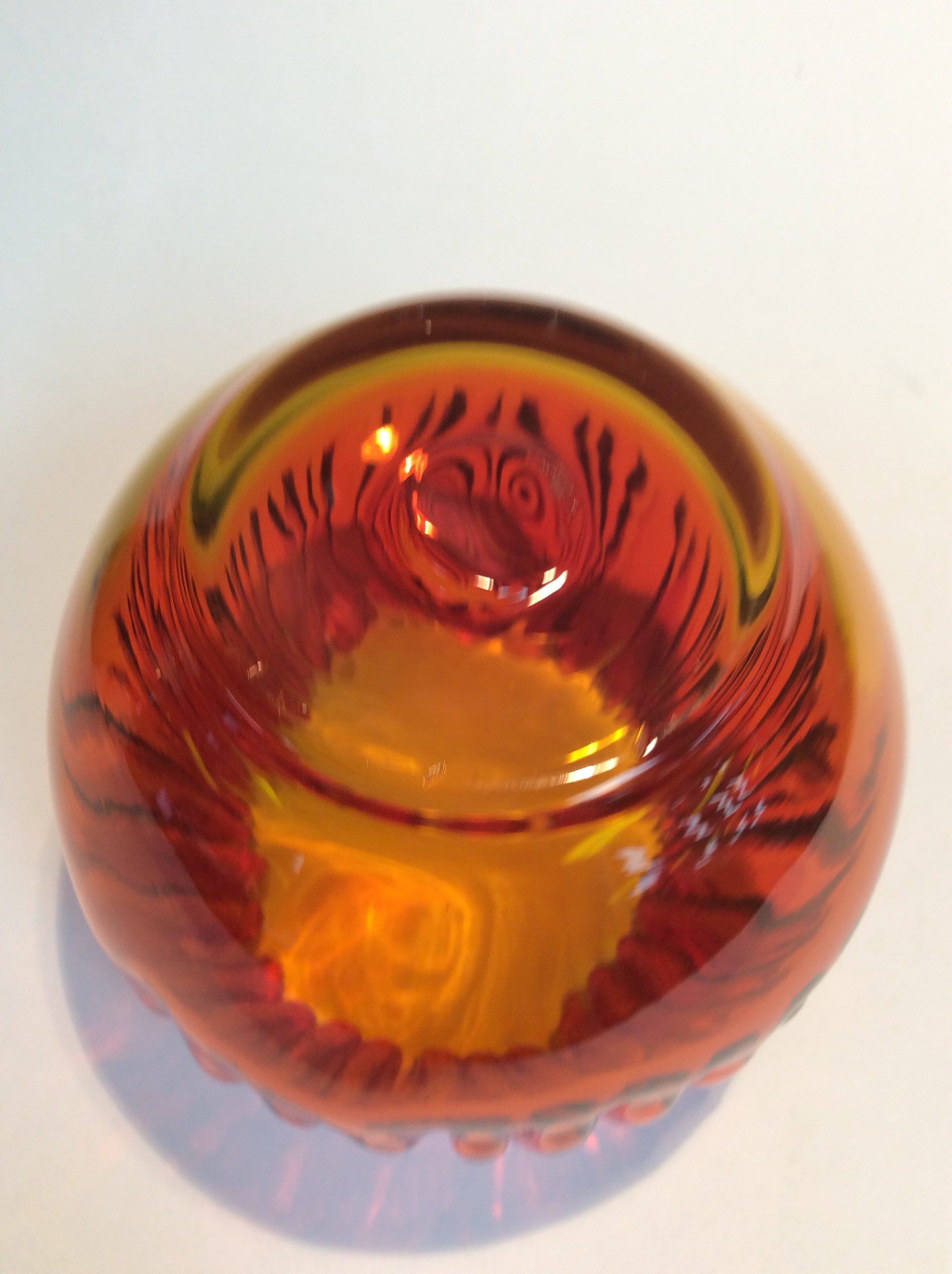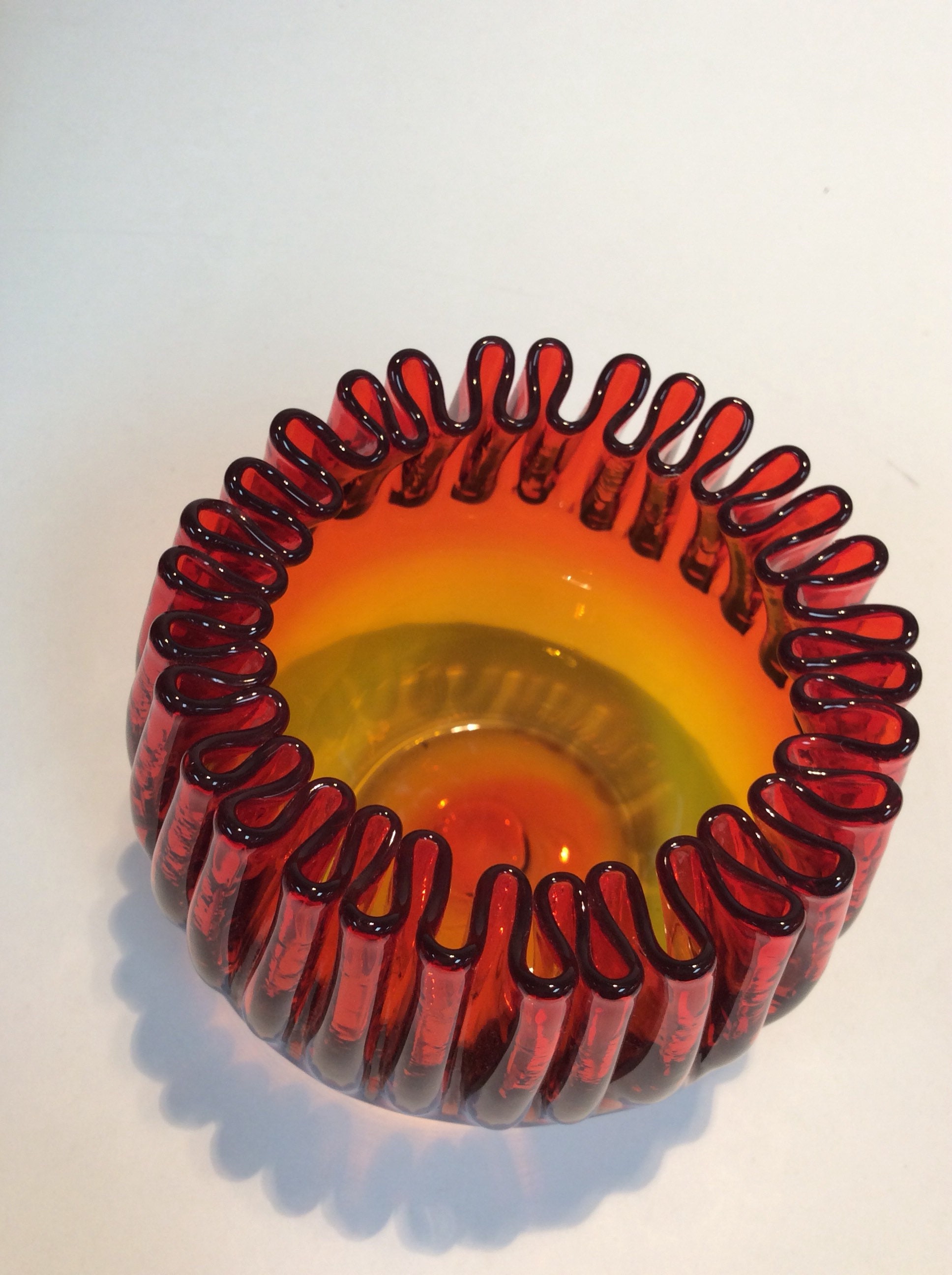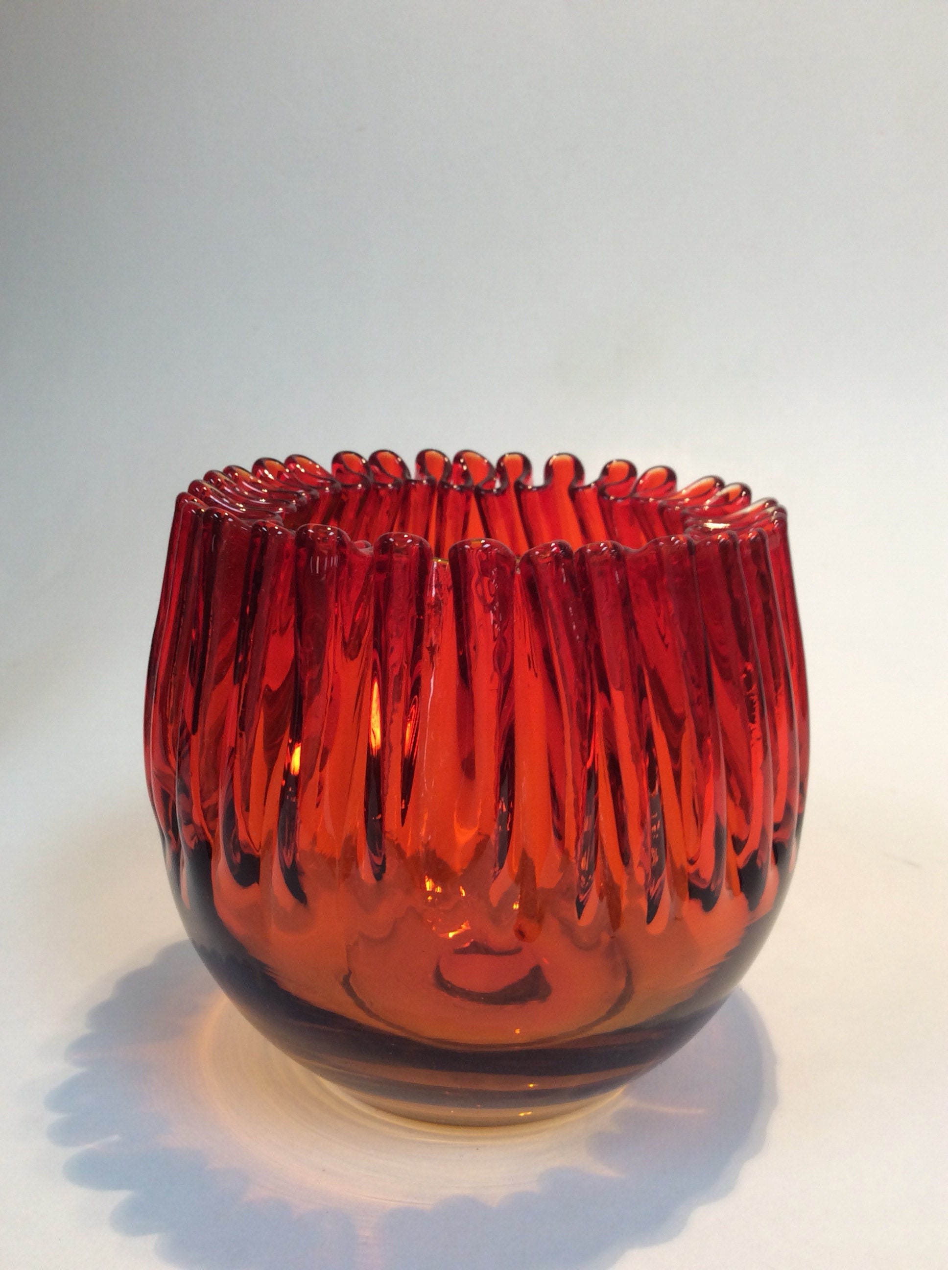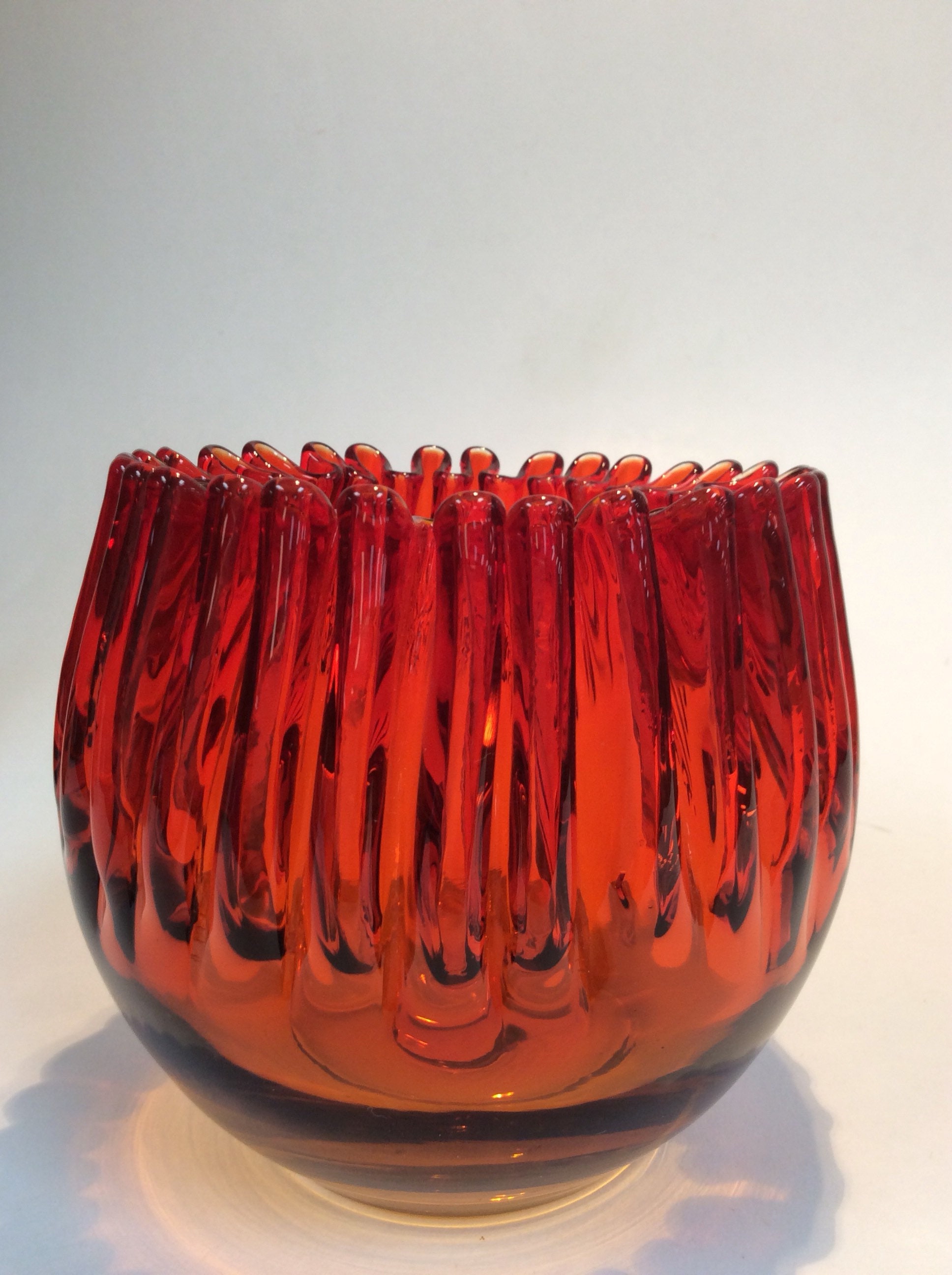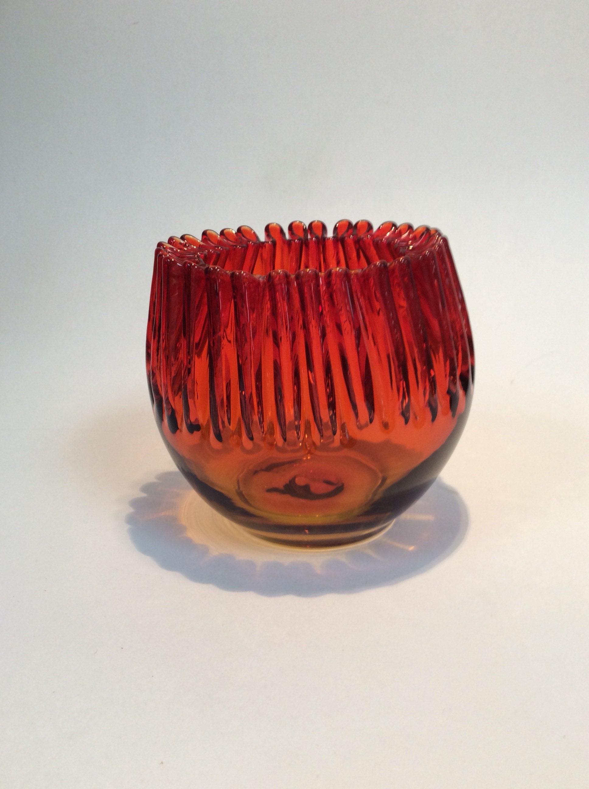 Blenko Glass vintage 538 crimped rose bowl in tangerine. This item was added to the Blenko catalog in 1953 but only available in this color after 1957.